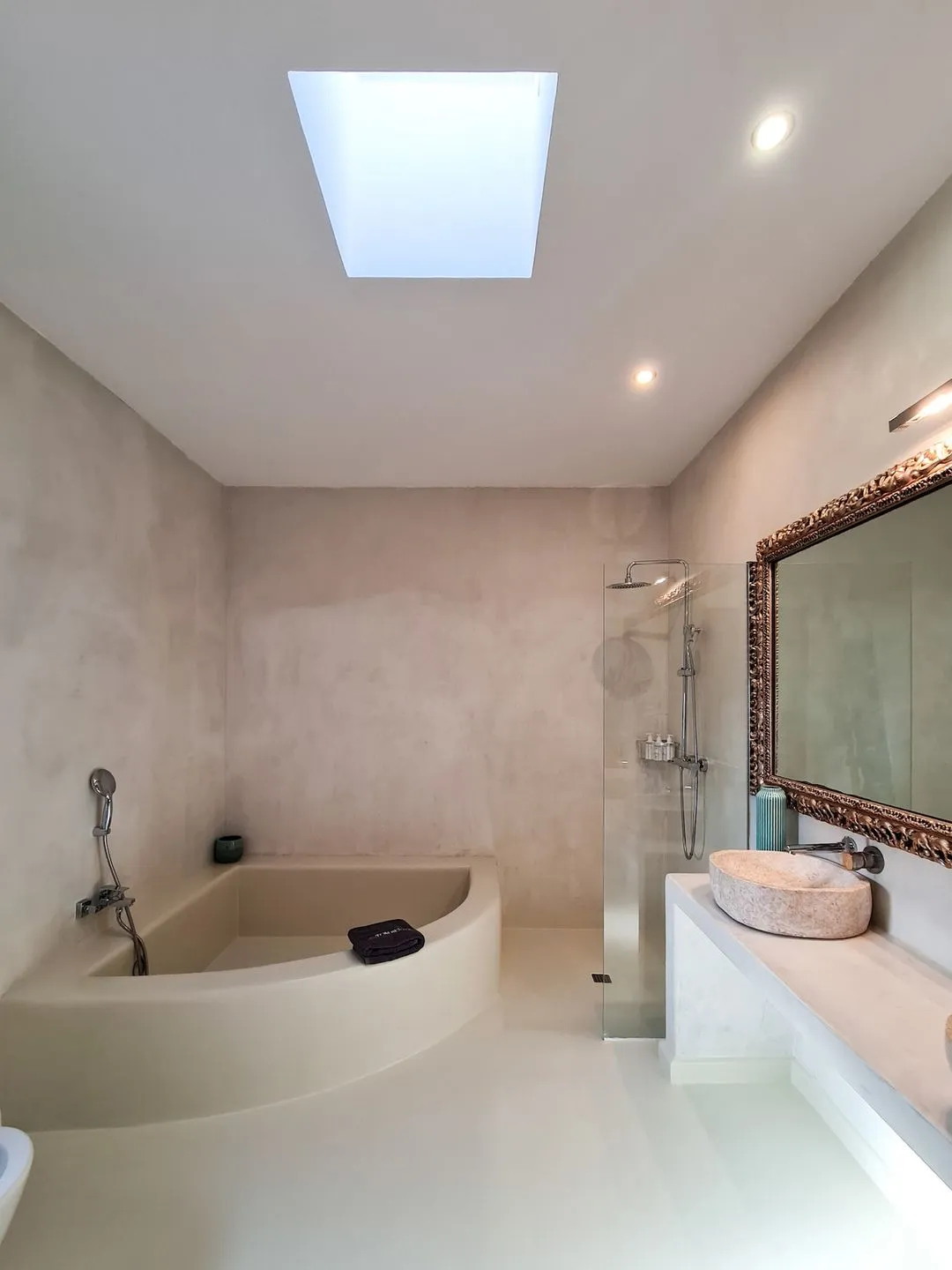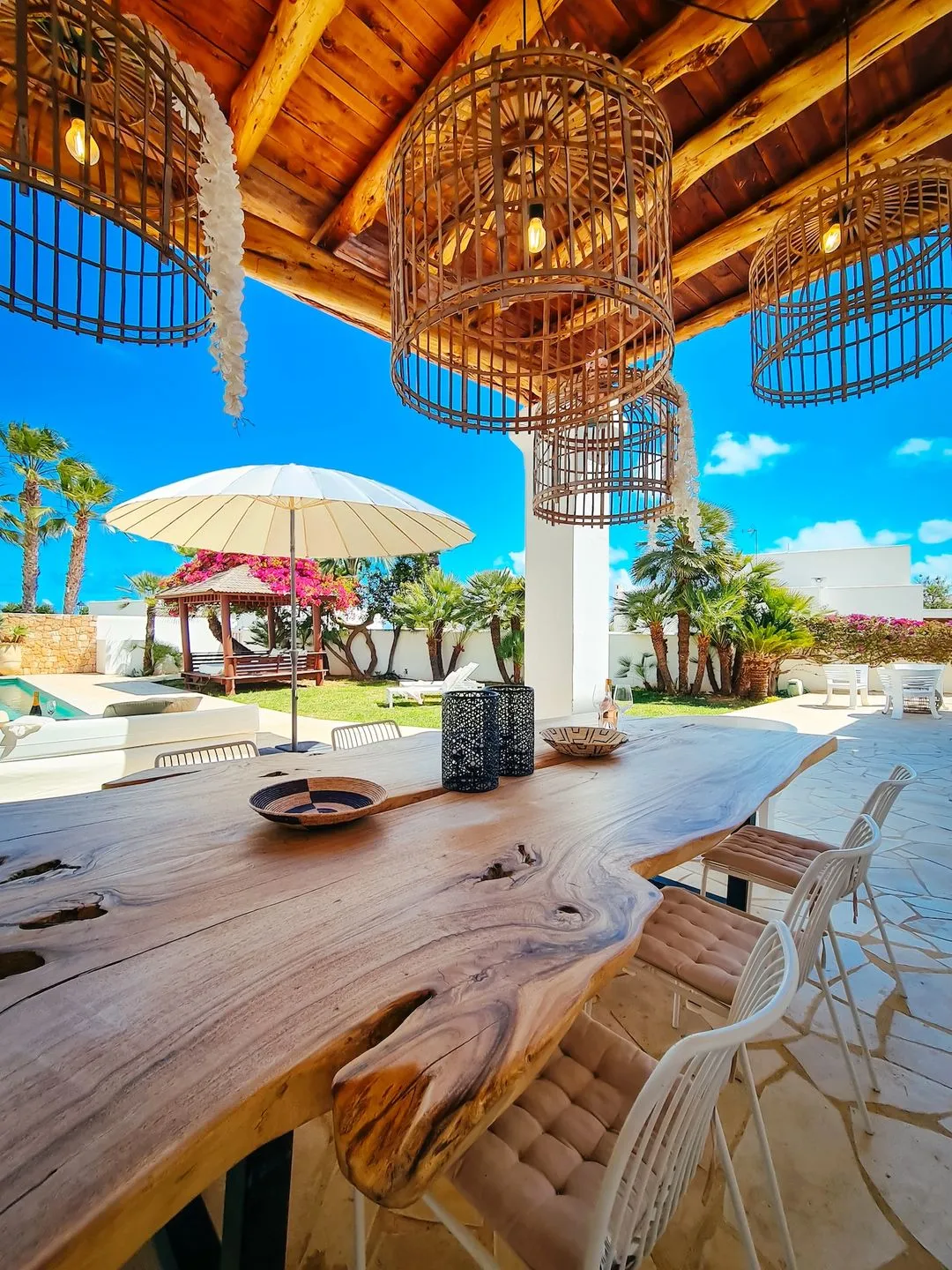 Der Außenbereich setzt den kreativen Charakter der Villa fort. Der große Pool sorgt an heißen Sommertagen für erfrischende Abkühlung, während zahlreiche Sonnenliegen, ein großes balinesisches Daybed und verschiedene Chill‑out‑Zonen perfekte Bedingungen für entspannte Nachmittage bieten. Ein langer, eleganter Holztisch im Außenbereich ist ideal für BBQ‑Abende, gemeinsame Dinner oder gesellige Drinks in warmer Abendstimmung.