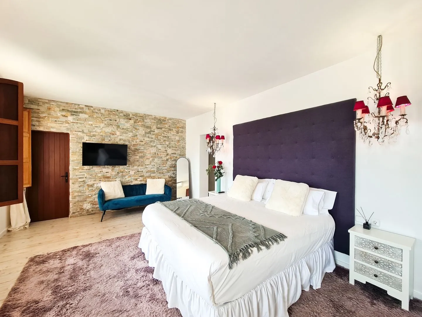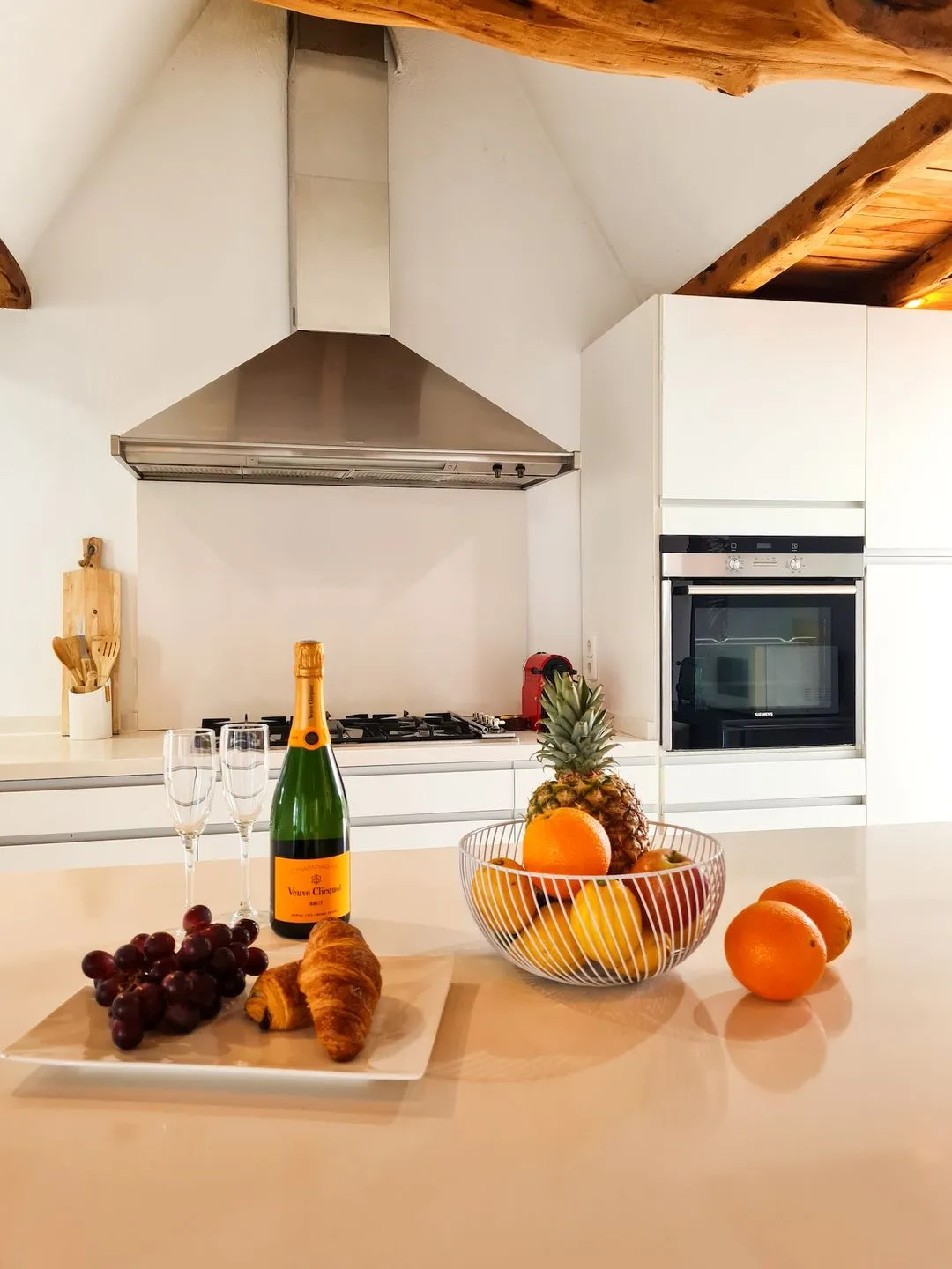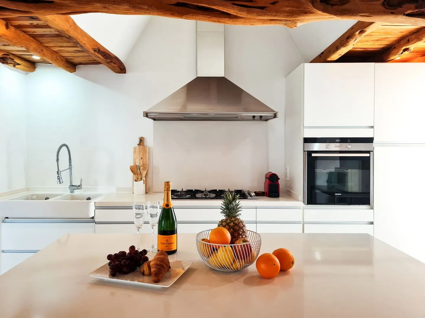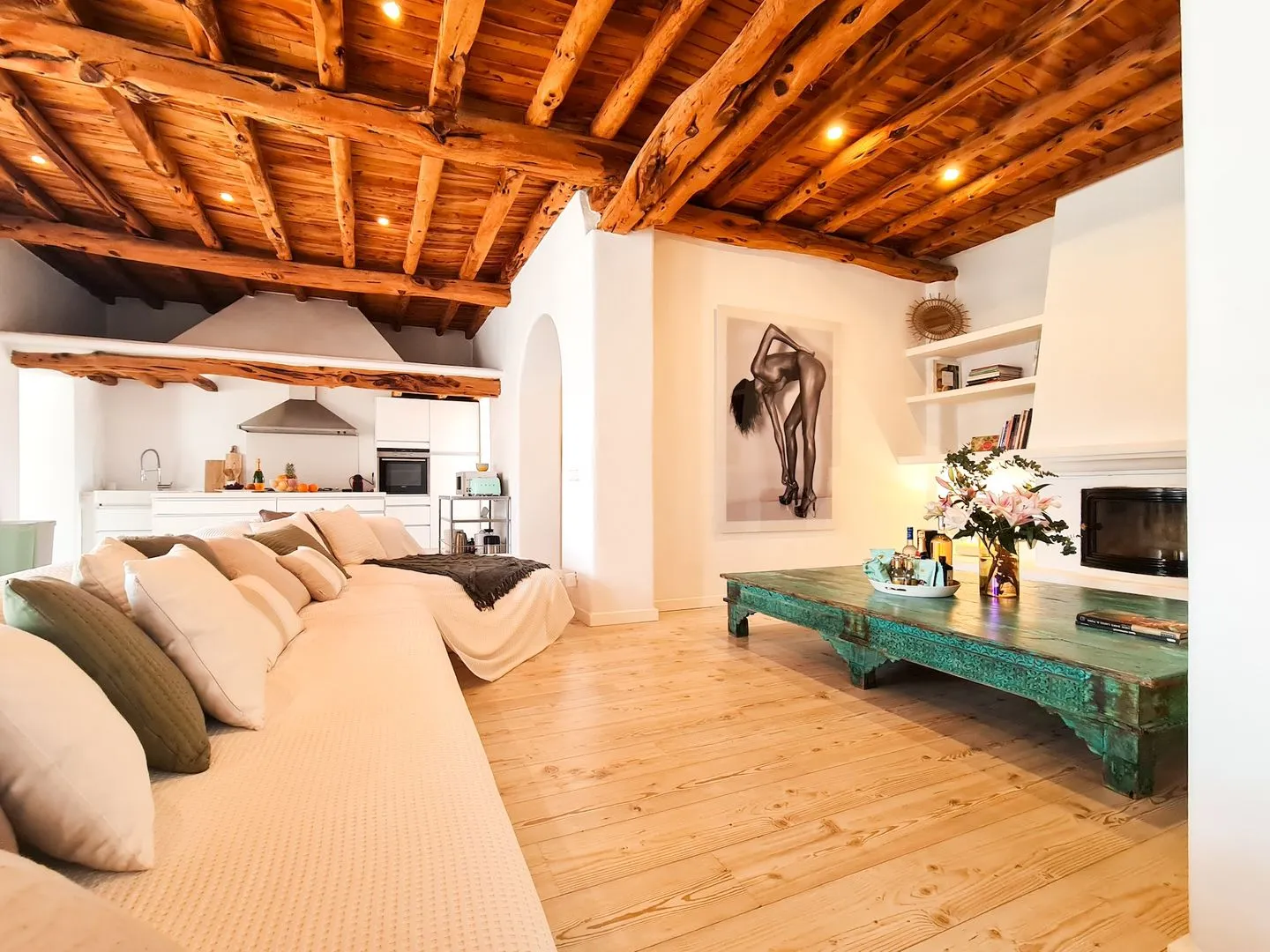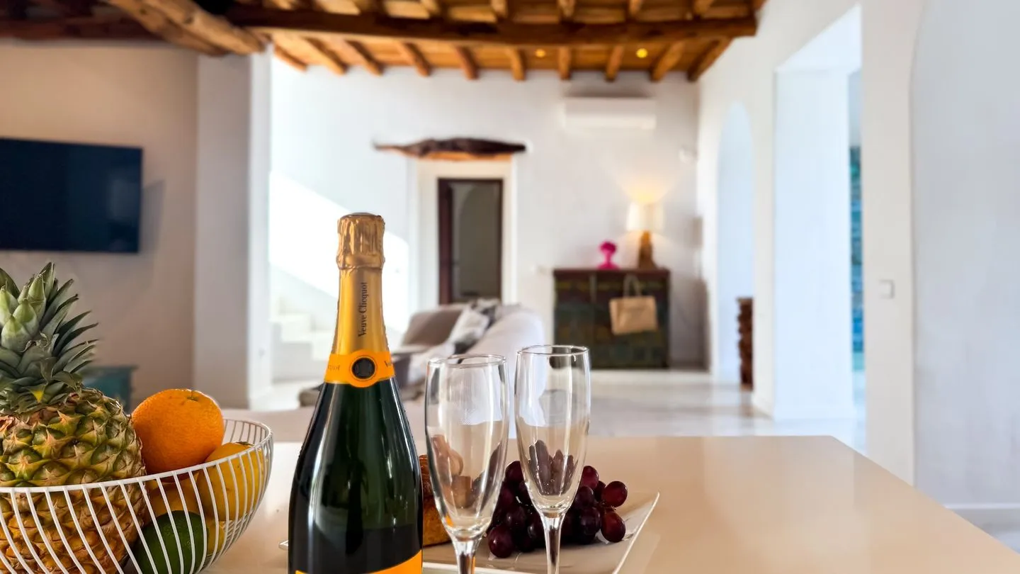 Im Inneren überzeugt der großzügige Wohn‑ und Essbereich mit offener Küche, der bewusst für gemeinsames Erleben gestaltet wurde. Eine große Sofalandschaft und ein Big‑Screen‑Smart‑TV schaffen den perfekten Rahmen – zum Entspannen, Streamen, für einen Aperitif oder den letzten Drink, bevor es ins Nachtleben geht.