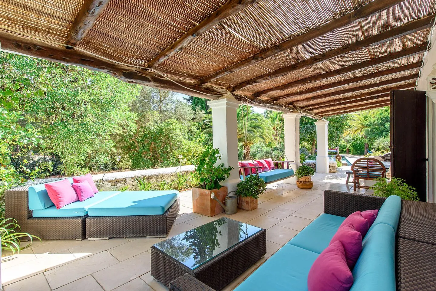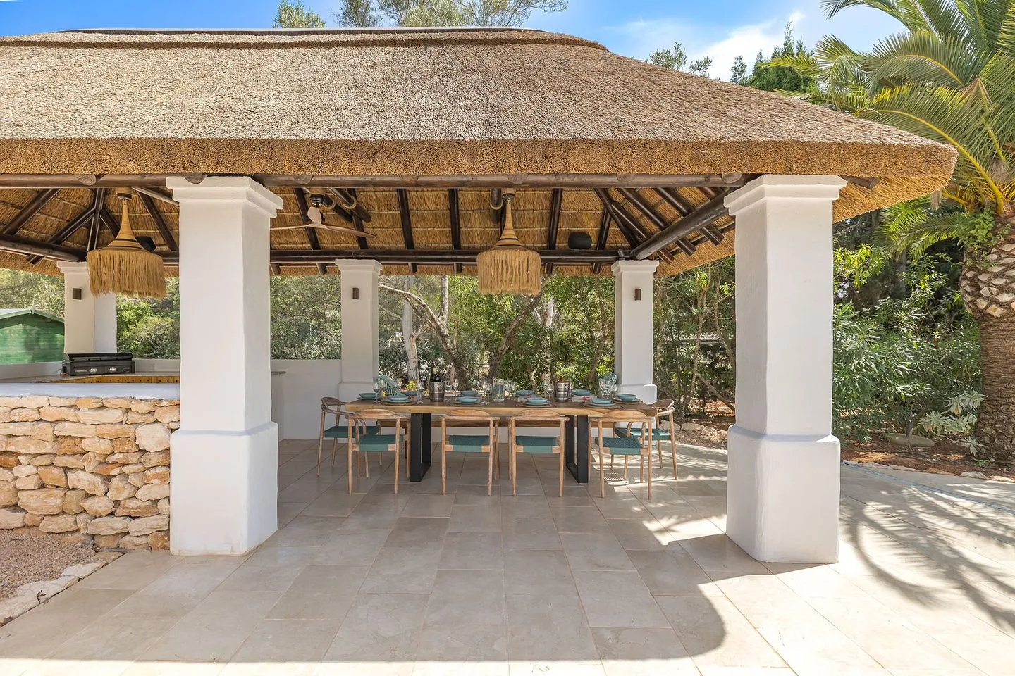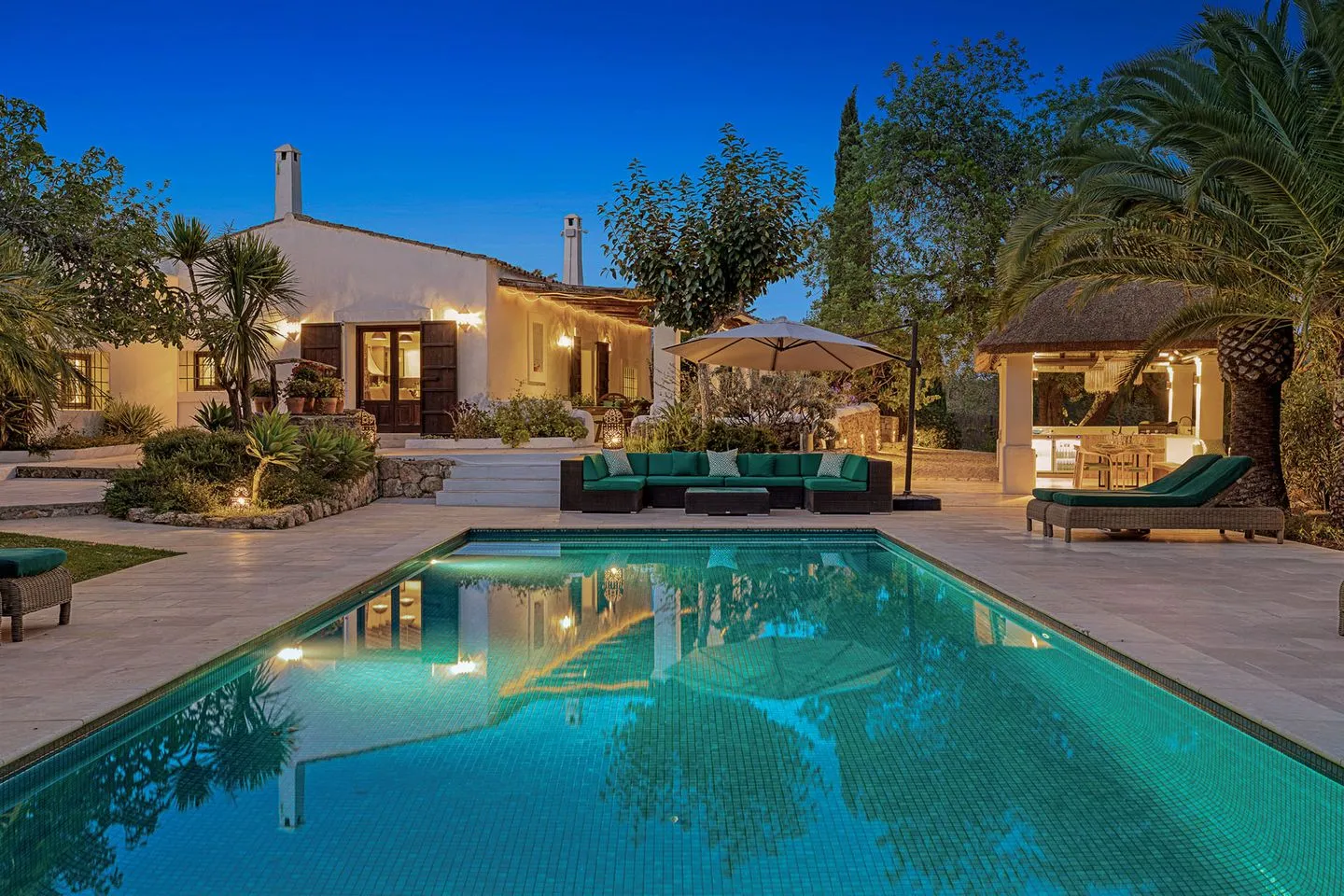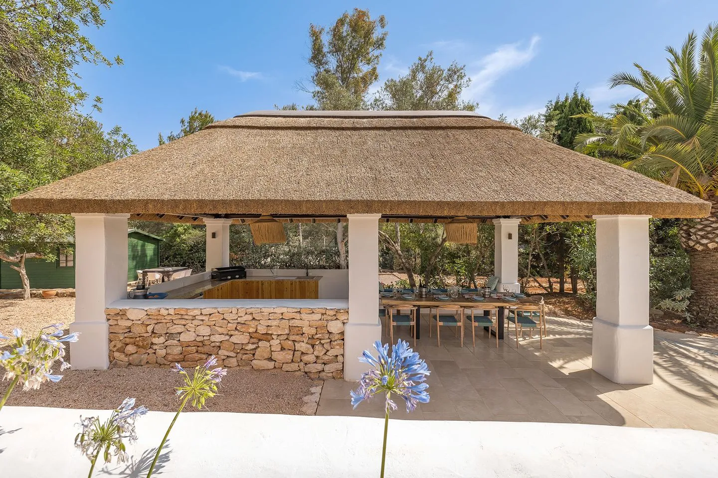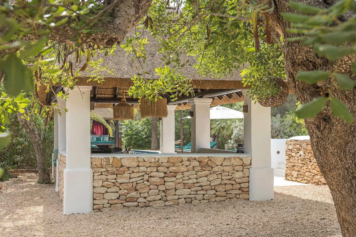 Die weitläufigen, liebevoll angelegten Gärten bilden ein abgeschiedenes Refugium im Herzen der ibizenkischen Landschaft. Ein großer Pool ist von üppiger tropischer Bepflanzung, Sonnenliegen, einer großzügigen Outdoor‑Sofalandschaft und einer freistehenden Hängematte umgeben. Ergänzt wird der Außenbereich durch einen neu errichteten Outdoor‑Küchen‑Pavillon, der sich perfekt für lange Sommerabende eignet.