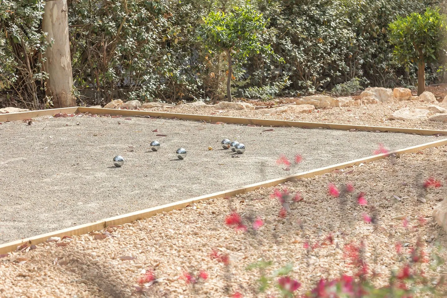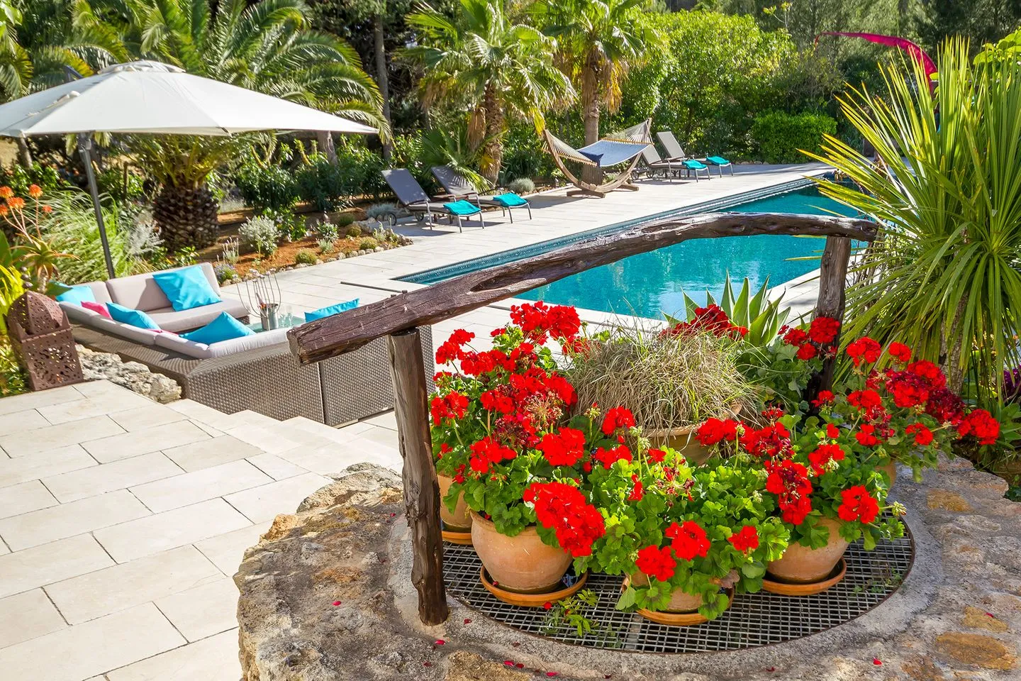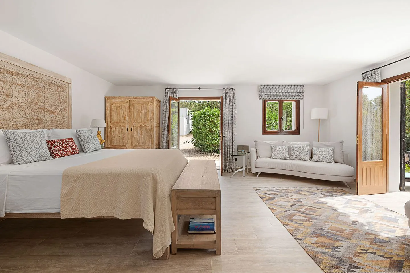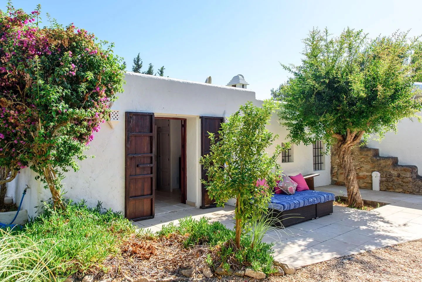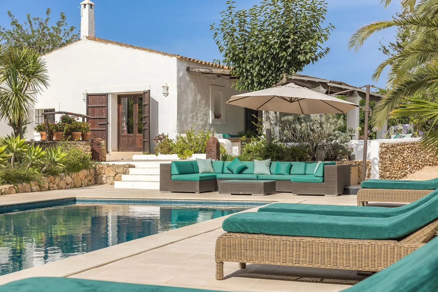 Die weitläufigen, liebevoll angelegten Gärten bilden ein abgeschiedenes Refugium im Herzen der ibizenkischen Landschaft. Ein großer Pool ist von üppiger tropischer Bepflanzung, Sonnenliegen, einer großzügigen Outdoor‑Sofalandschaft und einer freistehenden Hängematte umgeben. Ergänzt wird der Außenbereich durch einen neu errichteten Outdoor‑Küchen‑Pavillon, der sich perfekt für lange Sommerabende eignet.