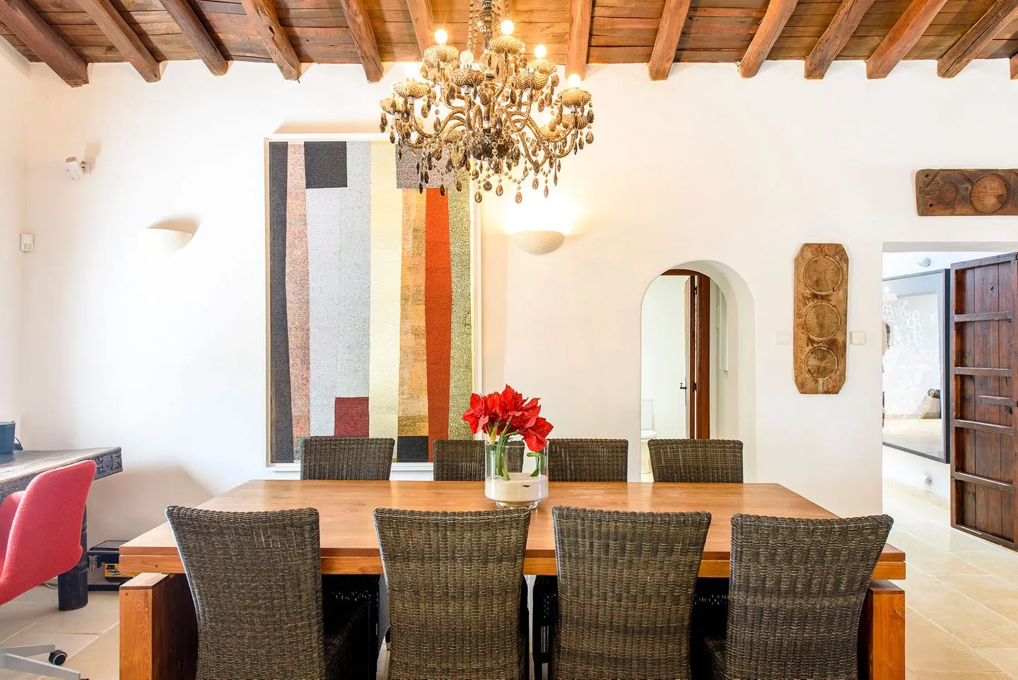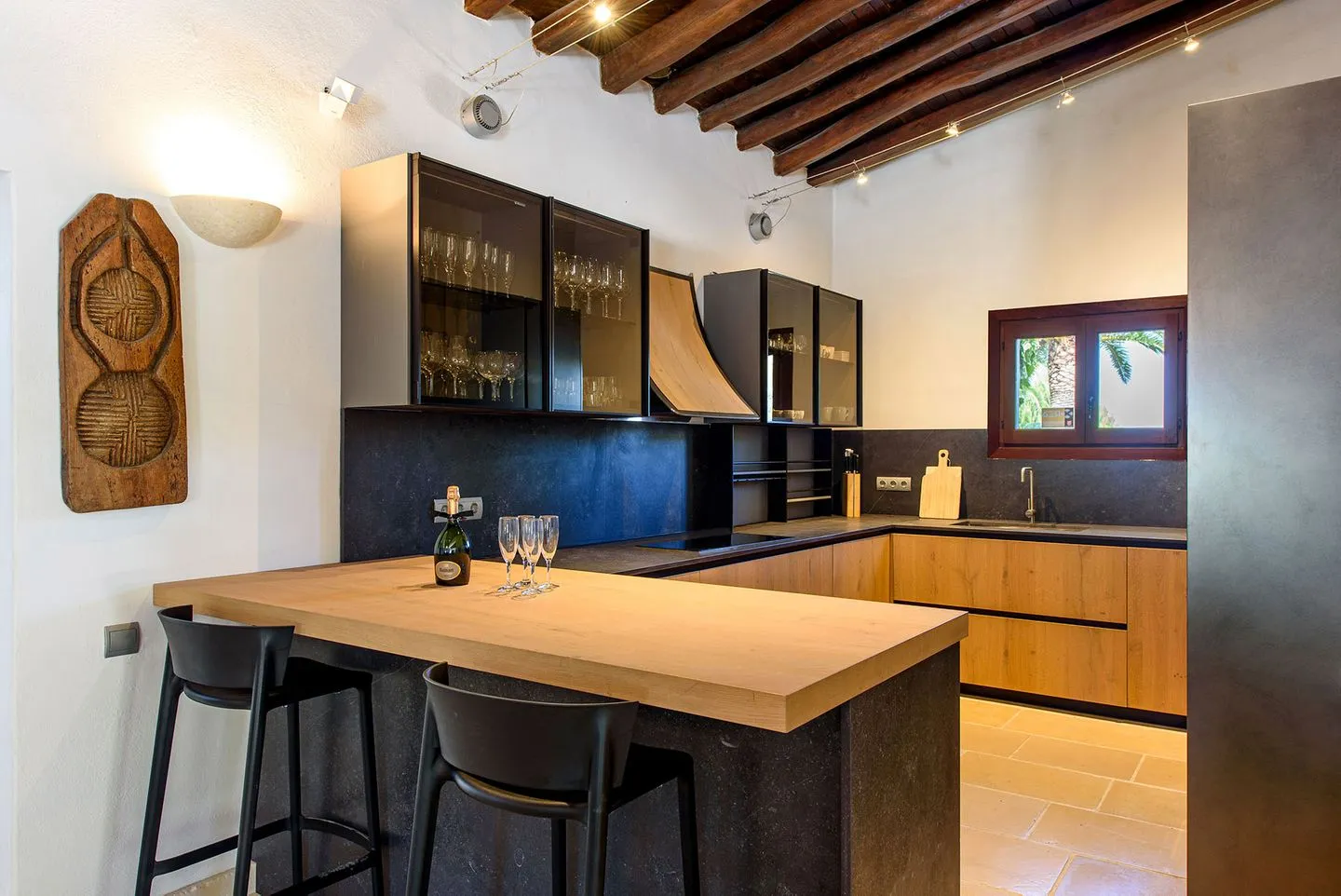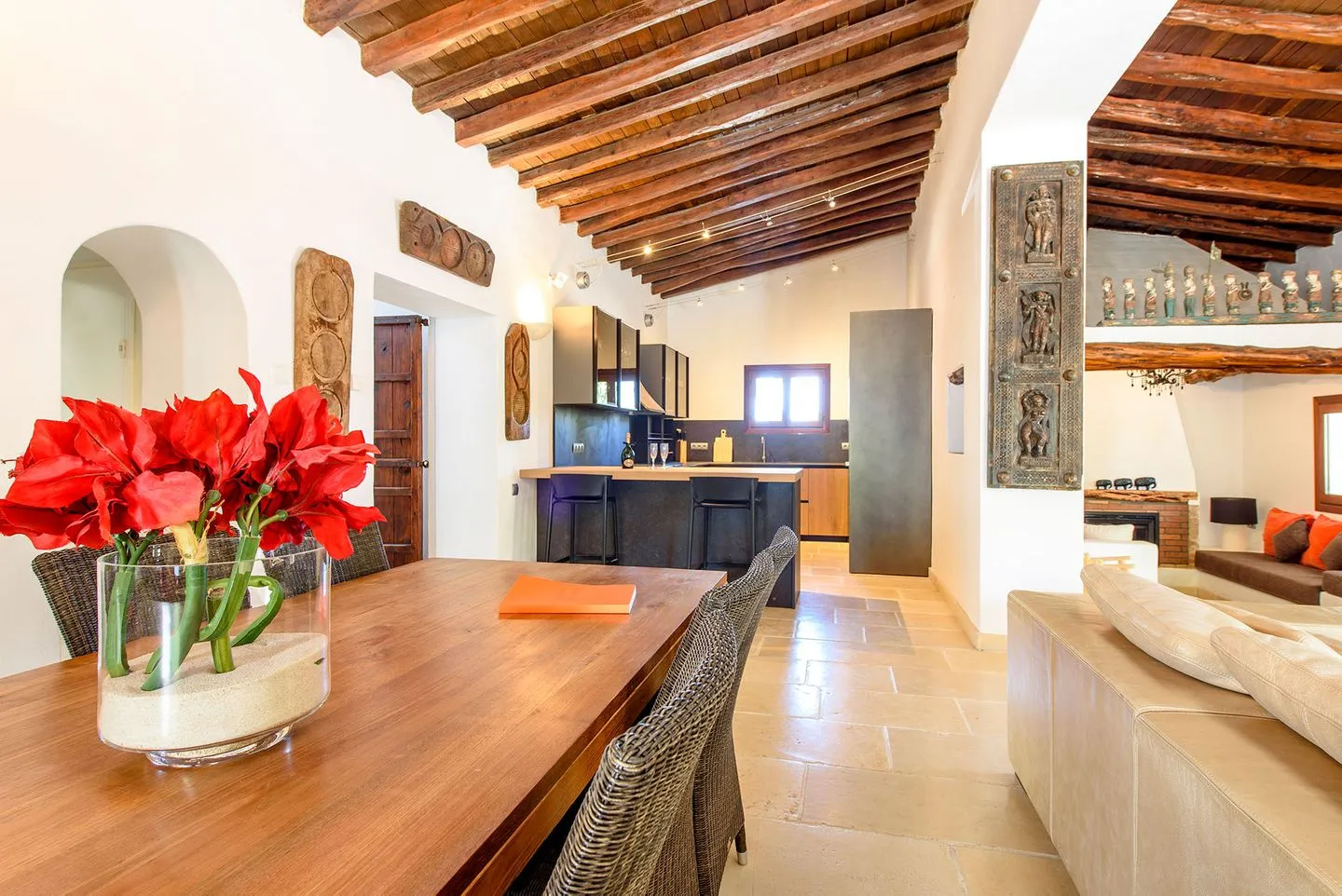 Im Inneren schafft die harmonische Verwendung natürlicher Materialien eine ruhige, entspannte Atmosphäre. Geflieste Böden, sichtbare Holzbalken und weiß gekalkte, massive Wände prägen den authentischen Charakter des Hauses. Der großzügige, offen gestaltete Wohnbereich umfasst eine gemütliche Lounge, einen eleganten Essbereich sowie eine moderne, hochwertig ausgestattete Küche und eignet sich ideal für gemeinsame Stunden mit Familie oder Freunden.