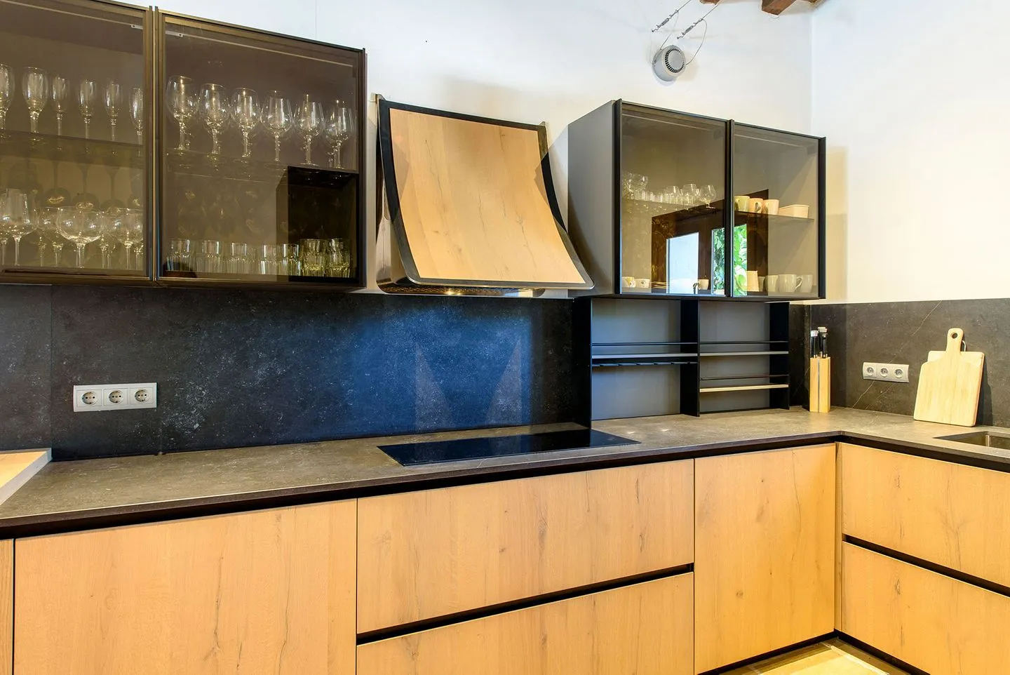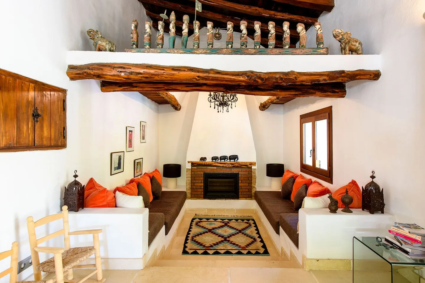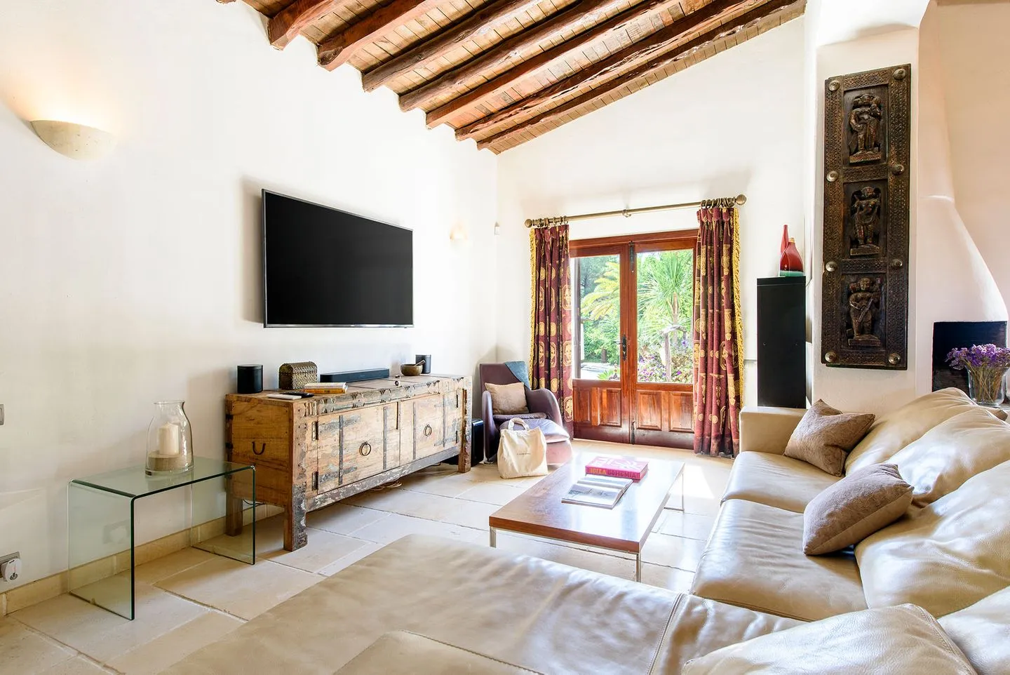 Im Inneren schafft die harmonische Verwendung natürlicher Materialien eine ruhige, entspannte Atmosphäre. Geflieste Böden, sichtbare Holzbalken und weiß gekalkte, massive Wände prägen den authentischen Charakter des Hauses. Der großzügige, offen gestaltete Wohnbereich umfasst eine gemütliche Lounge, einen eleganten Essbereich sowie eine moderne, hochwertig ausgestattete Küche und eignet sich ideal für gemeinsame Stunden mit Familie oder Freunden.