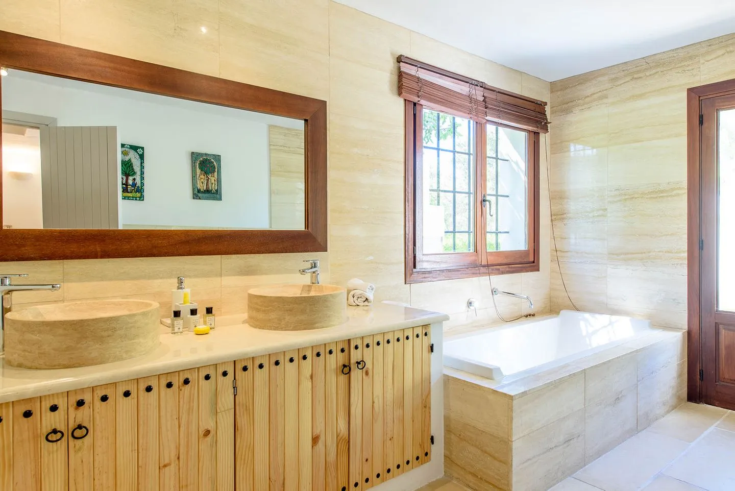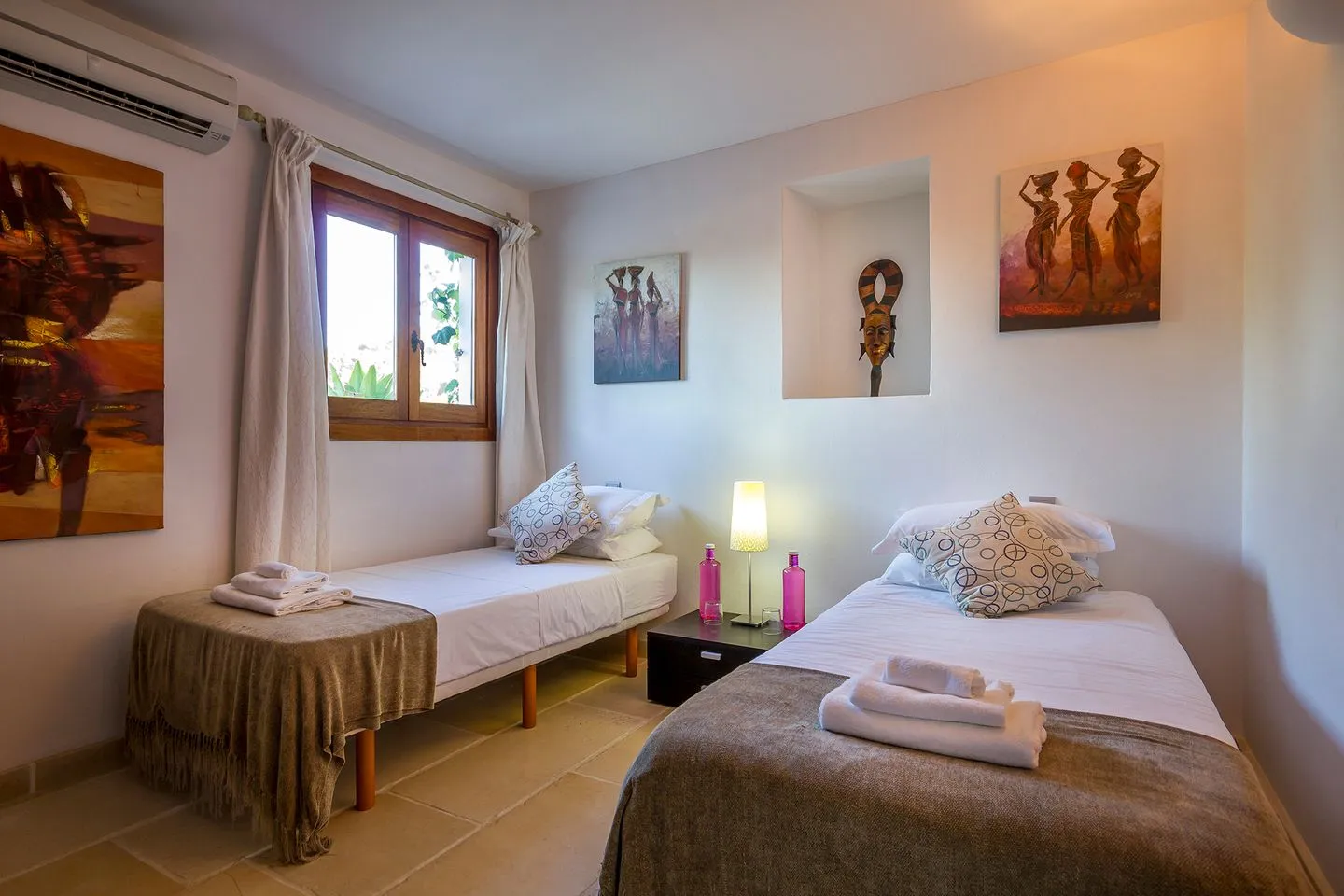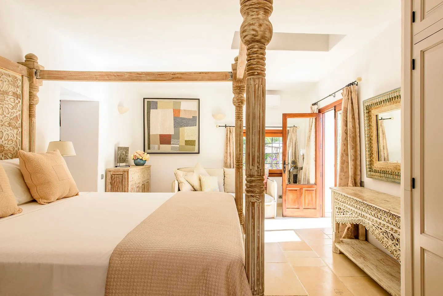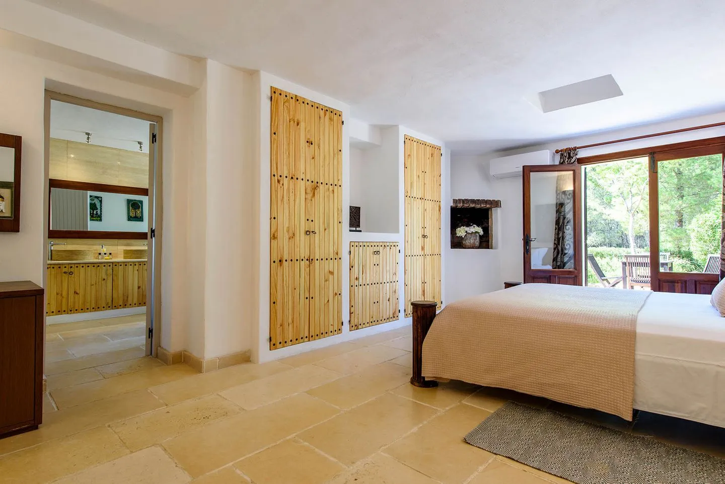 Die Finca verfügt über vier Schlafzimmer, alle mit Bad en suite. Zwei Master‑Suiten bieten private Terrassen mit freistehenden Badewannen und Regenduschen im Außenbereich. Ein weiteres Doppelschlafzimmer öffnet sich direkt zur Yoga‑Zone mit balinesischem Pavillon, während das vierte Schlafzimmer als komfortables Twin‑Doppelzimmer gestaltet ist.