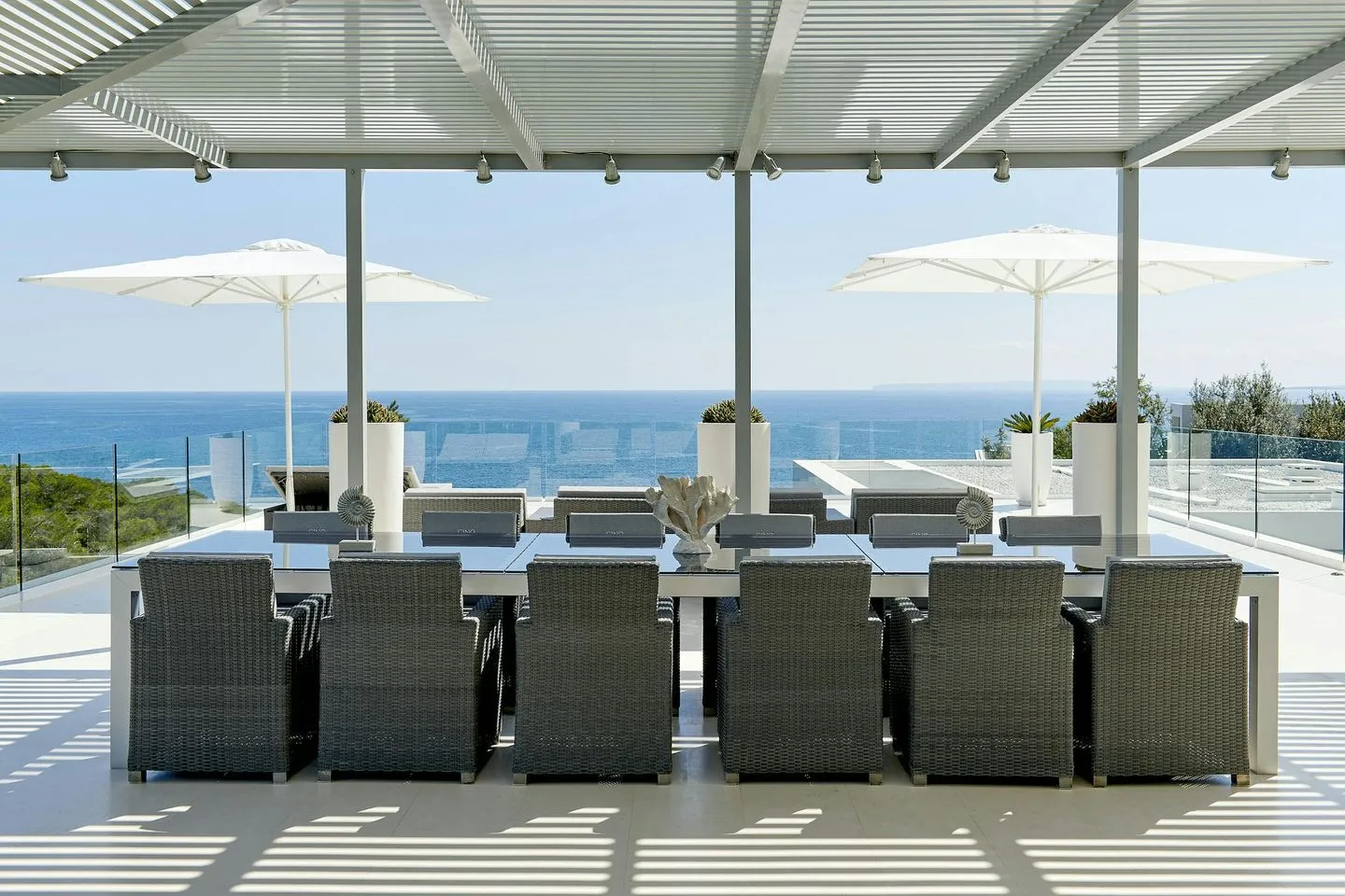 Die großzügigen Außenbereiche sind konsequent auf den Meerblick ausgerichtet. Eine weitläufige Terrasse bietet ideale Voraussetzungen für gesellige Abende und stilvolle Dinner unter freiem Himmel. Der private, beheizte Infinity‑Pool sowie der Hot Tub eröffnen traumhafte Ausblicke über die Palmenkronen hinweg bis zum offenen Meer. Tagsüber laden Sonnenliegen zum Entspannen ein, während man am Abend den Sonnenuntergang über den umliegenden Pinienwäldern von den komfortablen Lounge‑Bereichen aus genießt. Eine moderne Pergola bietet Schutz und schafft eine elegante Atmosphäre für lange Abende unter dem Sternenhimmel.