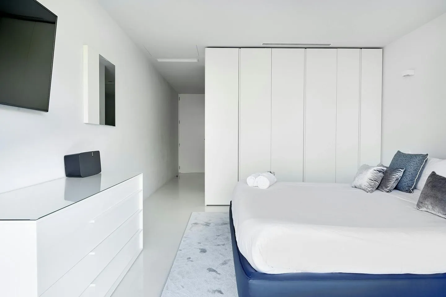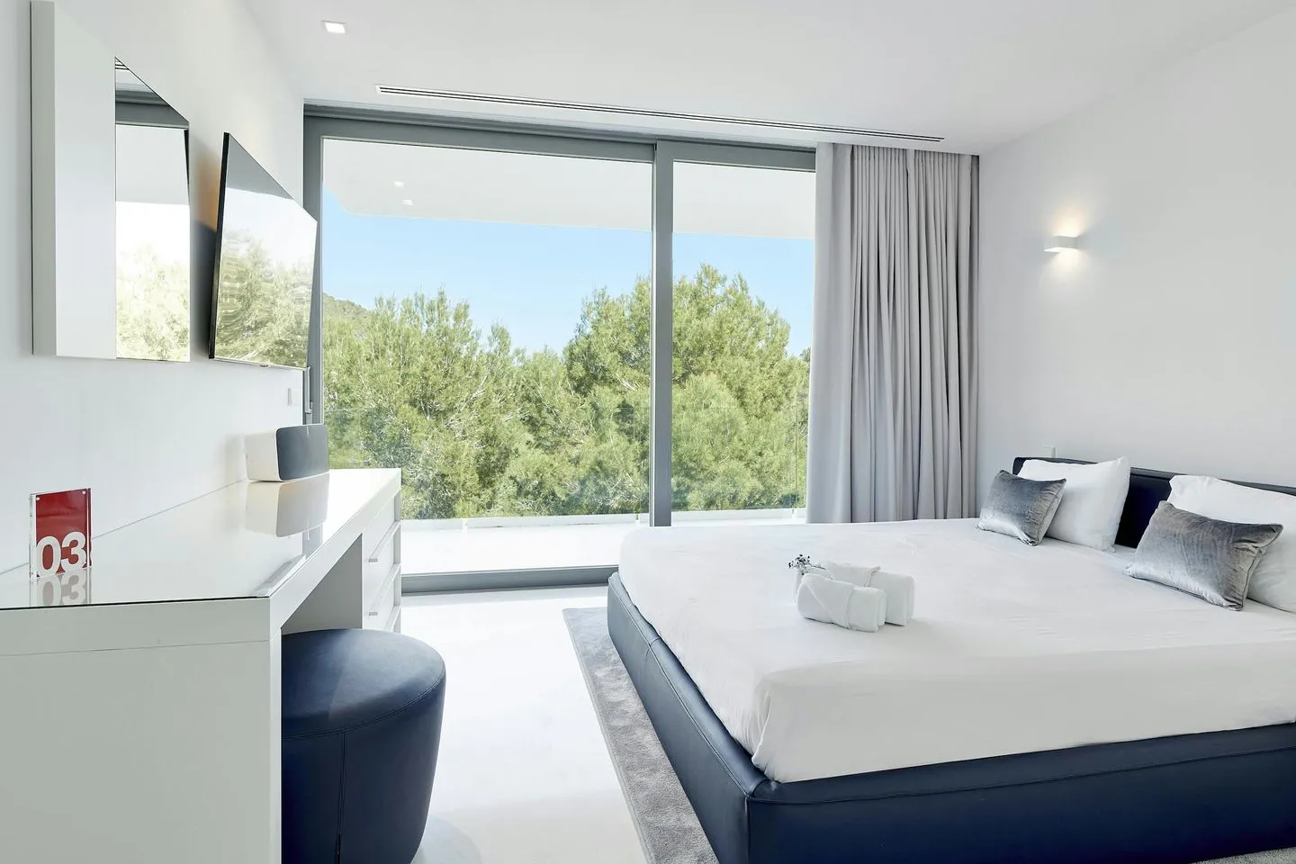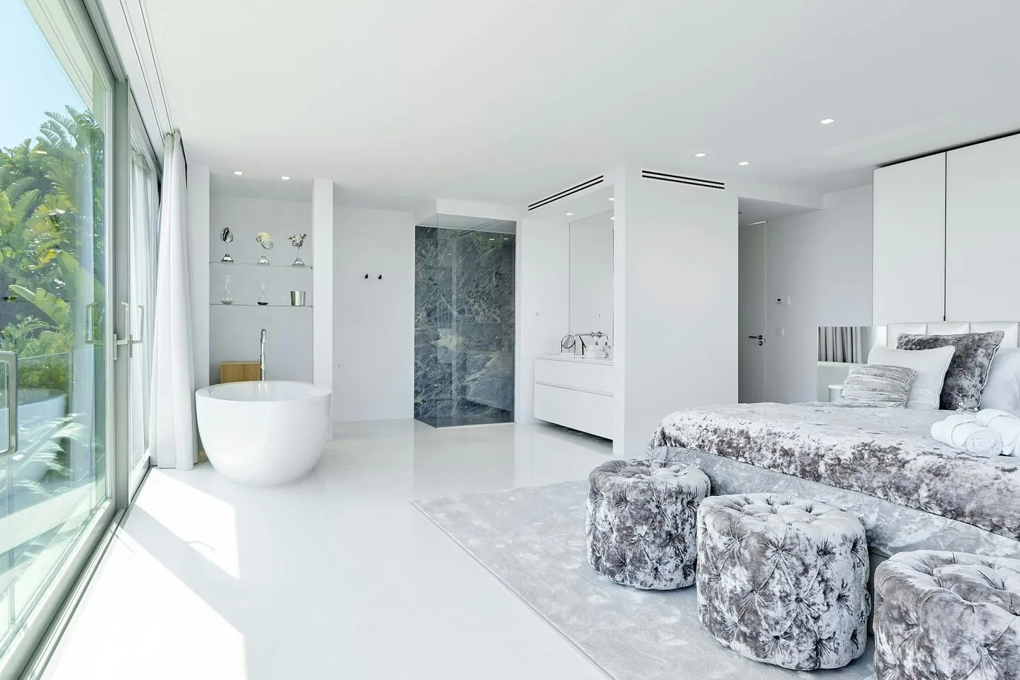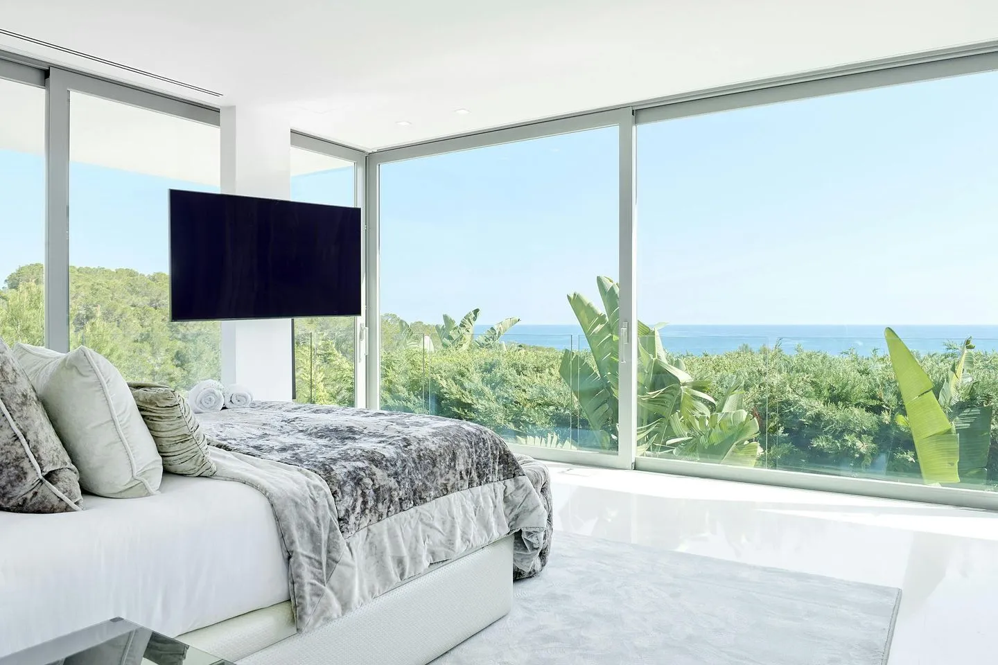 Auch die Innenräume der Villa Martina Ibiza sind so gestaltet, dass der Meerblick stets präsent bleibt. Bodentiefe, verschiebbare Glasfronten öffnen die Wohnbereiche zur Terrasse und durchfluten das Haus mit Licht. Das Interieur wurde vom renommierten Architekten Bruno Erpicum entworfen und verbindet edle Materialien, weiche Stoffe und moderne Oberflächen in dezenten Grautönen zu einem zeitlos eleganten Gesamtbild.