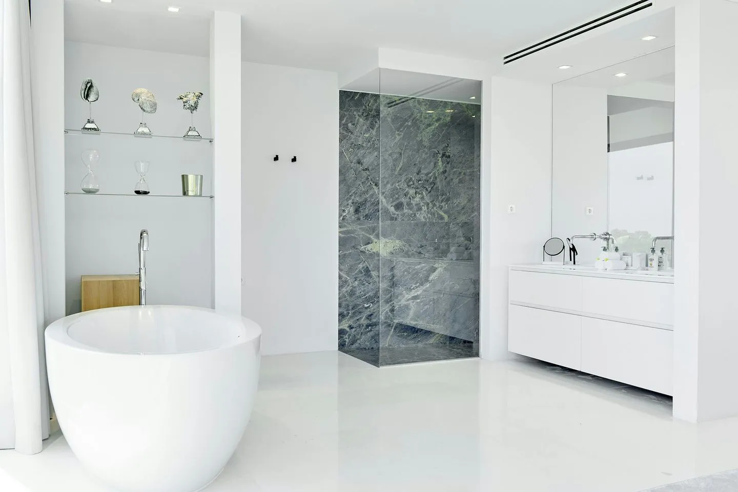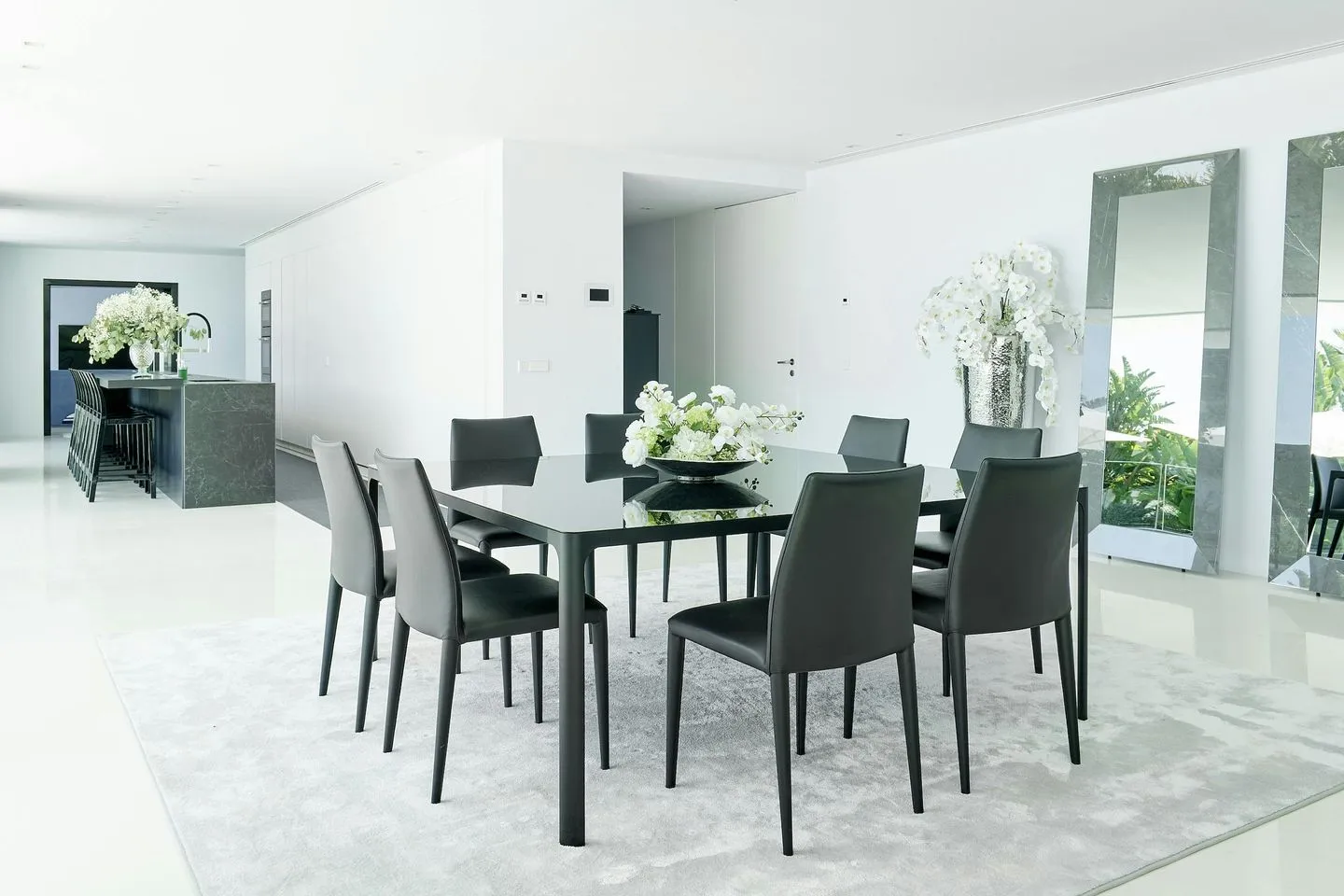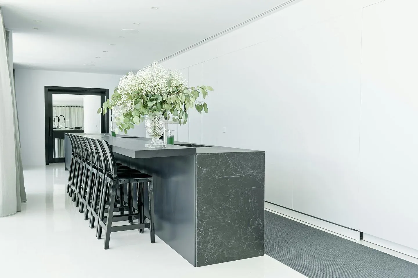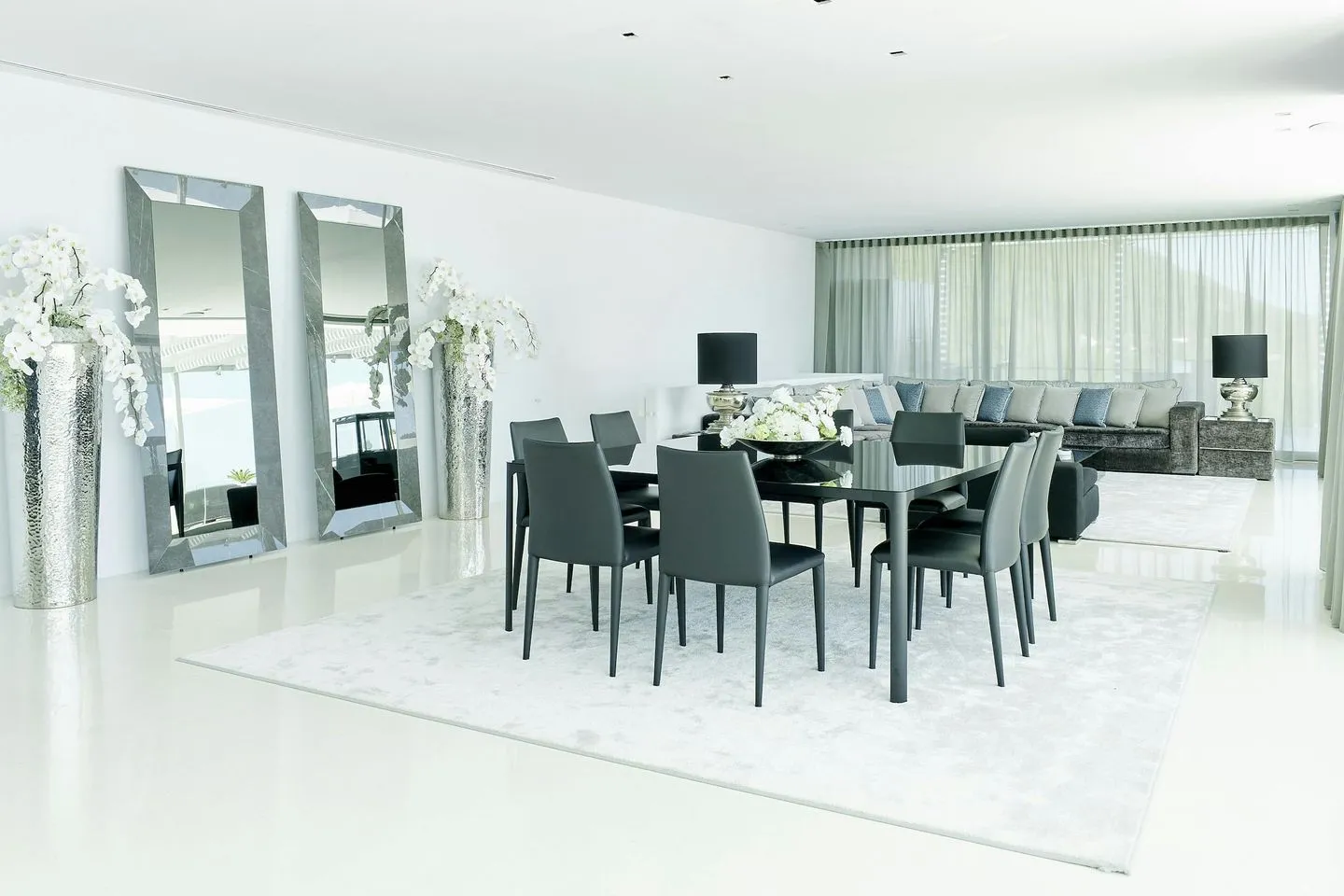 Auch die Innenräume der Villa Martina Ibiza sind so gestaltet, dass der Meerblick stets präsent bleibt. Bodentiefe, verschiebbare Glasfronten öffnen die Wohnbereiche zur Terrasse und durchfluten das Haus mit Licht. Das Interieur wurde vom renommierten Architekten Bruno Erpicum entworfen und verbindet edle Materialien, weiche Stoffe und moderne Oberflächen in dezenten Grautönen zu einem zeitlos eleganten Gesamtbild.