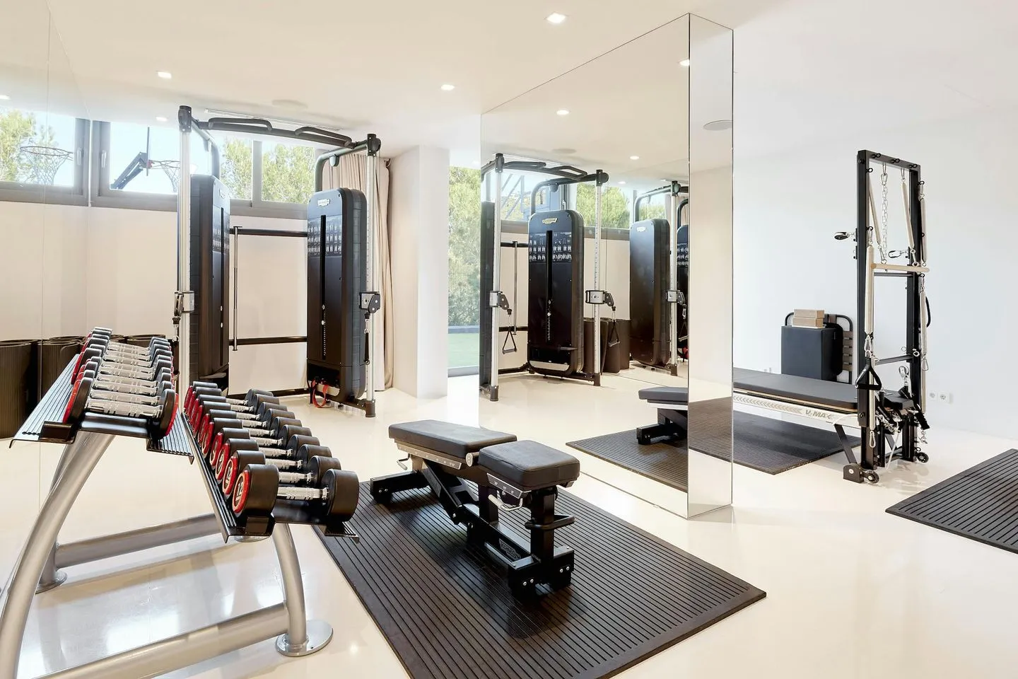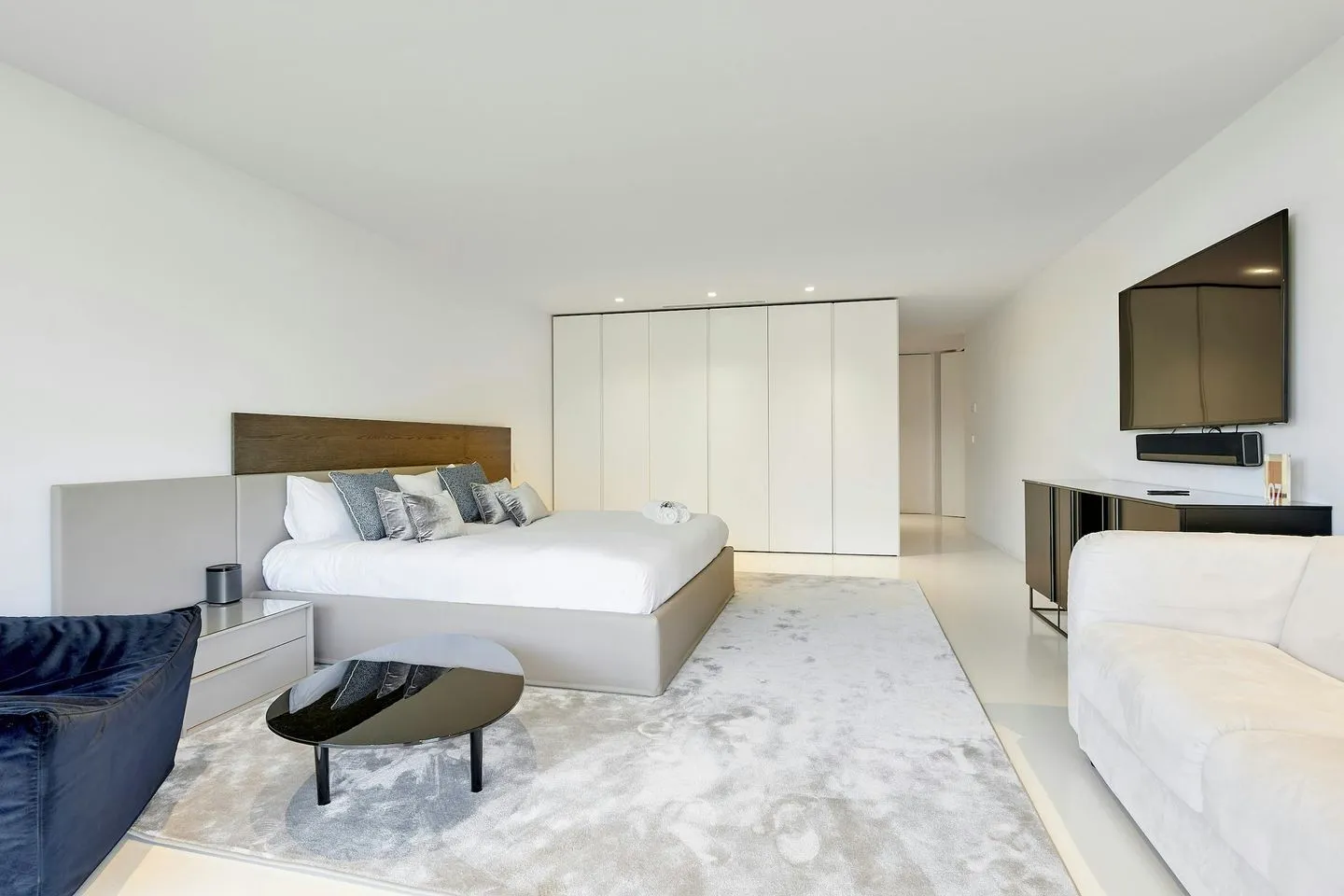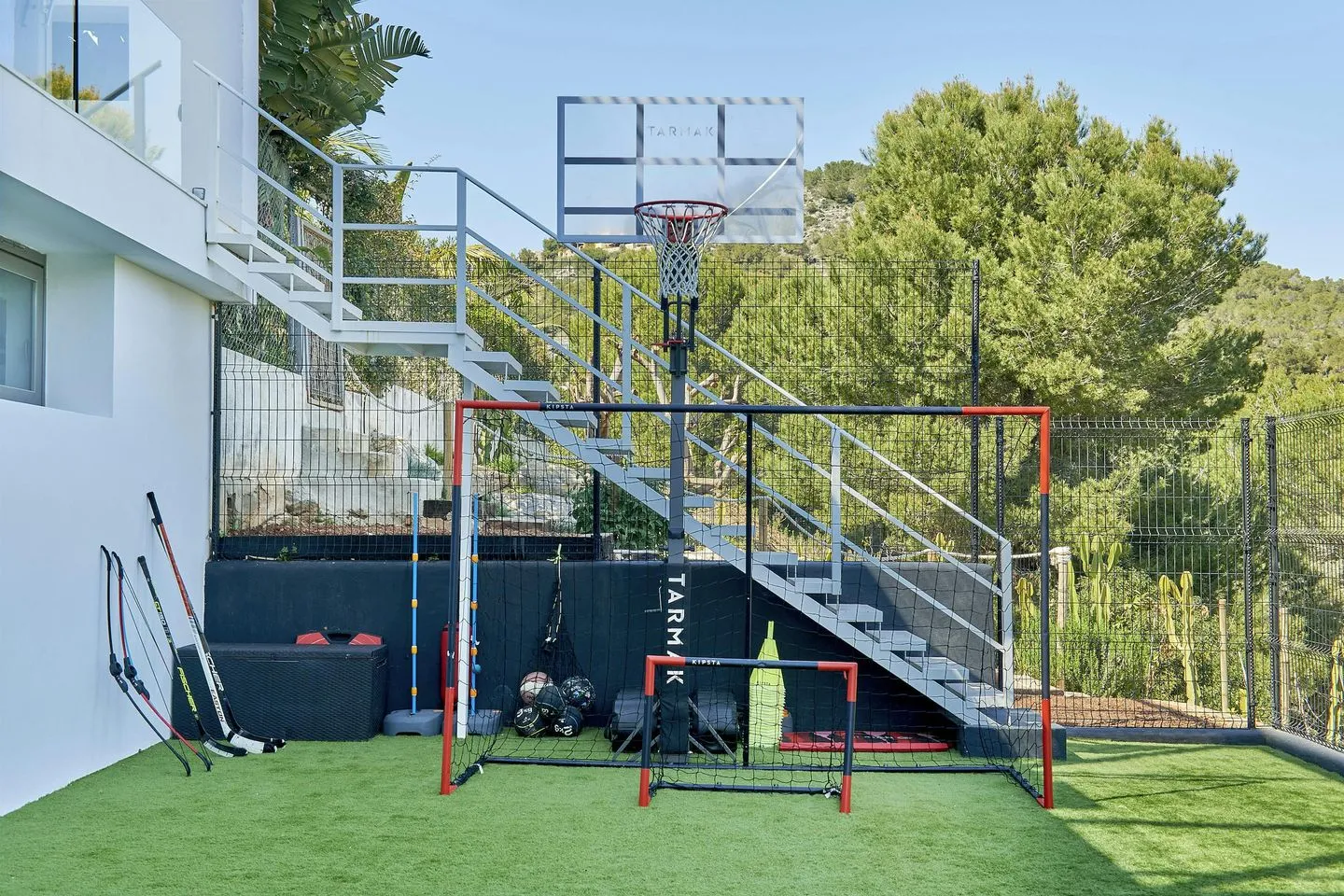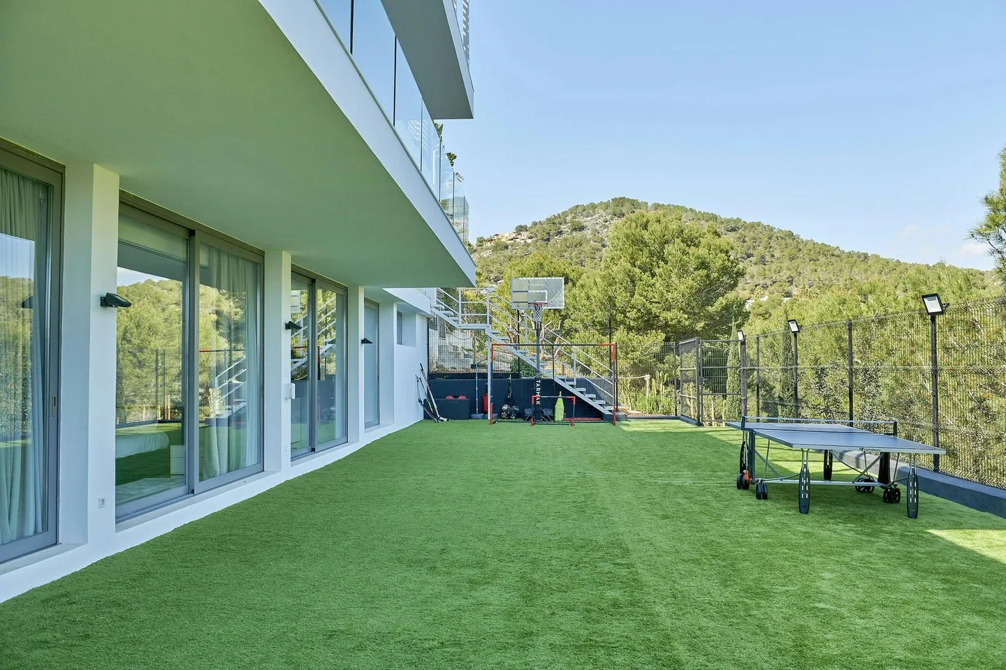 Küche, Essbereich und Wohnlounge gehen fließend ineinander über und bilden einen großzügigen offenen Wohnraum mit Blick über Pool und Meer. Ergänzt wird das Raumangebot durch ein gemütliches Heimkino, einen großzügigen Games‑ und Entertainment‑Bereich sowie ein lichtdurchflutetes Fitnessstudio mit modernsten Technogym‑Geräten. Ein multifunktionaler Sportplatz erweitert das Freizeitangebot zusätzlich. Separate Räumlichkeiten für Personal oder Nannys sind ebenfalls vorhanden.