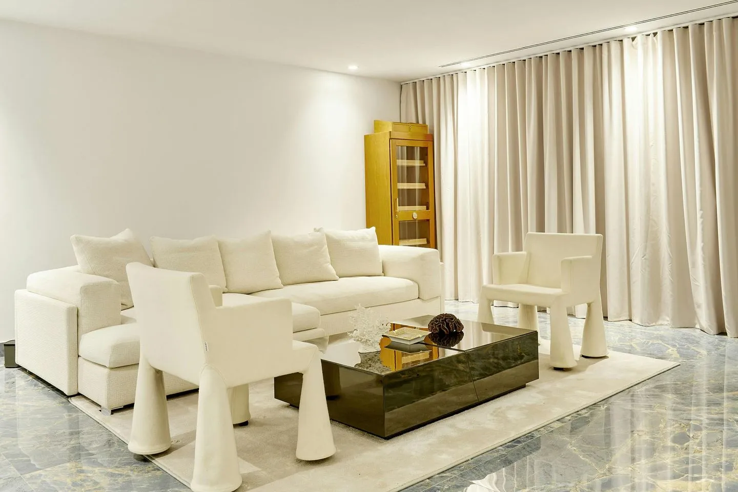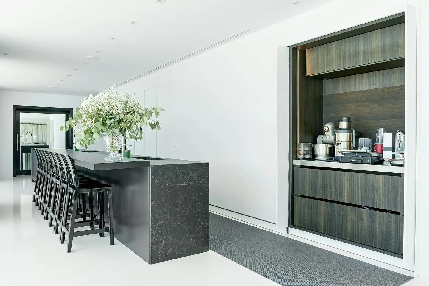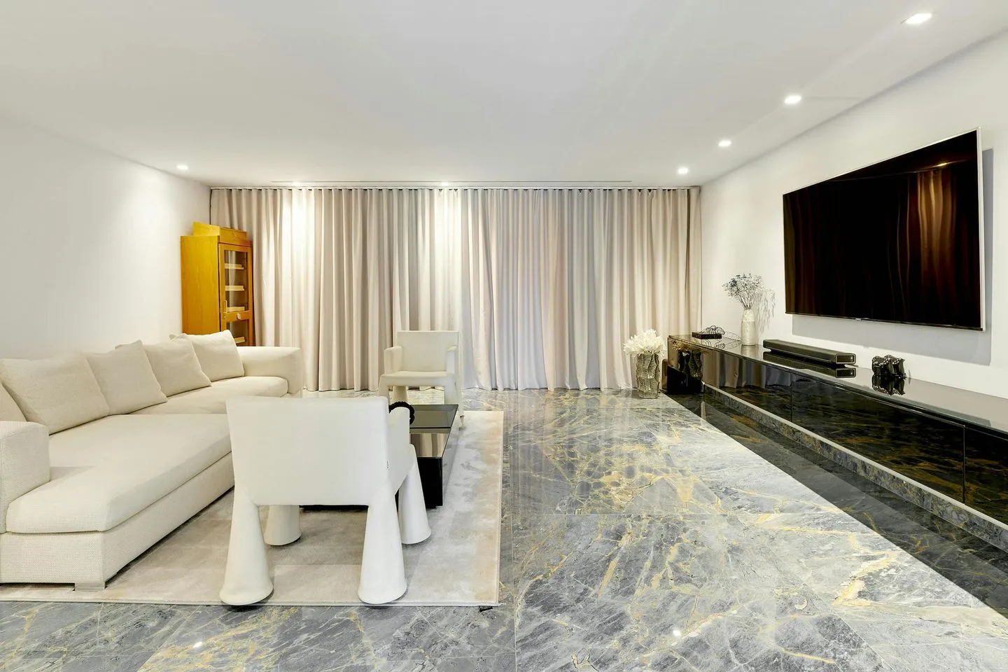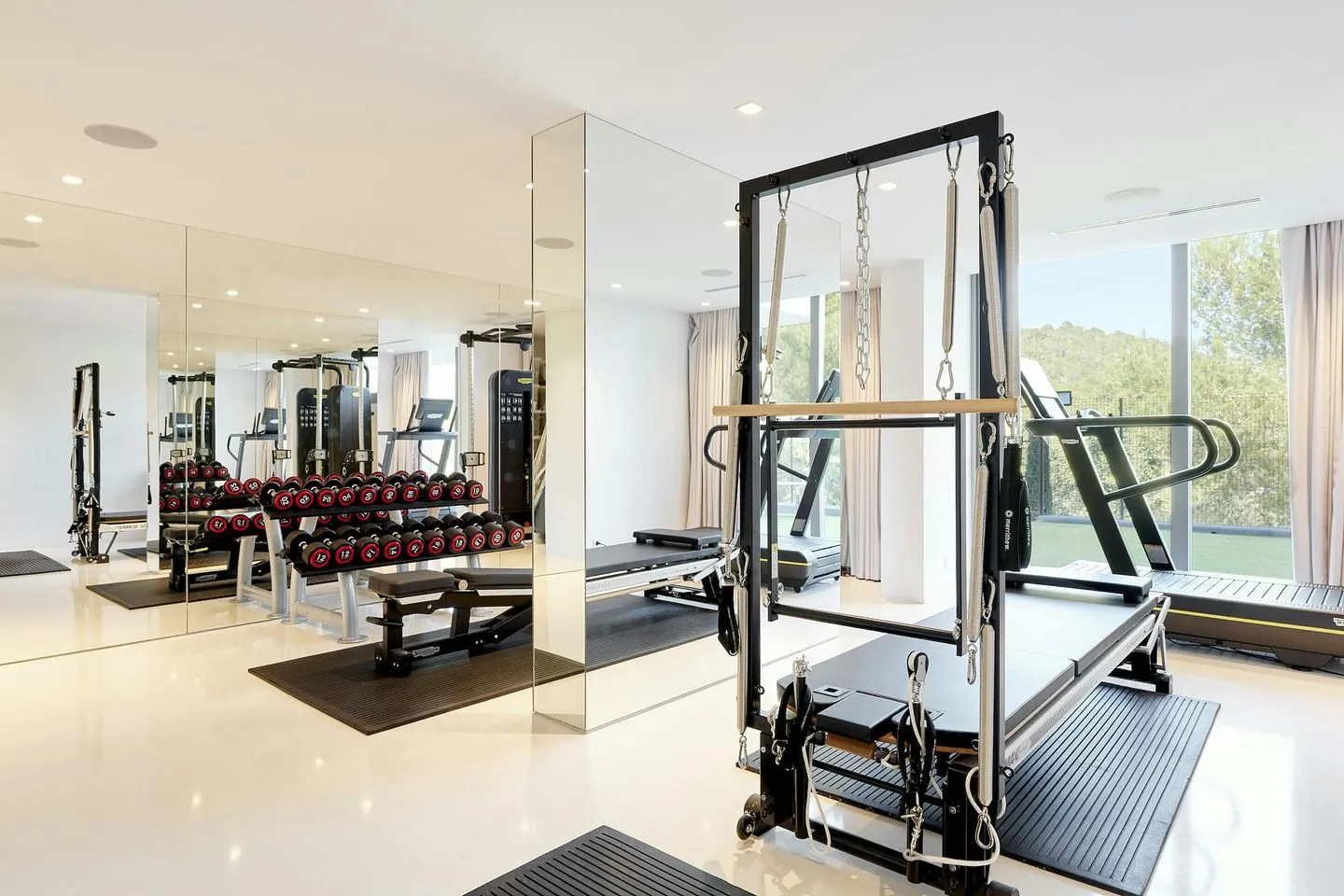 Küche, Essbereich und Wohnlounge gehen fließend ineinander über und bilden einen großzügigen offenen Wohnraum mit Blick über Pool und Meer. Ergänzt wird das Raumangebot durch ein gemütliches Heimkino, einen großzügigen Games‑ und Entertainment‑Bereich sowie ein lichtdurchflutetes Fitnessstudio mit modernsten Technogym‑Geräten. Ein multifunktionaler Sportplatz erweitert das Freizeitangebot zusätzlich. Separate Räumlichkeiten für Personal oder Nannys sind ebenfalls vorhanden.