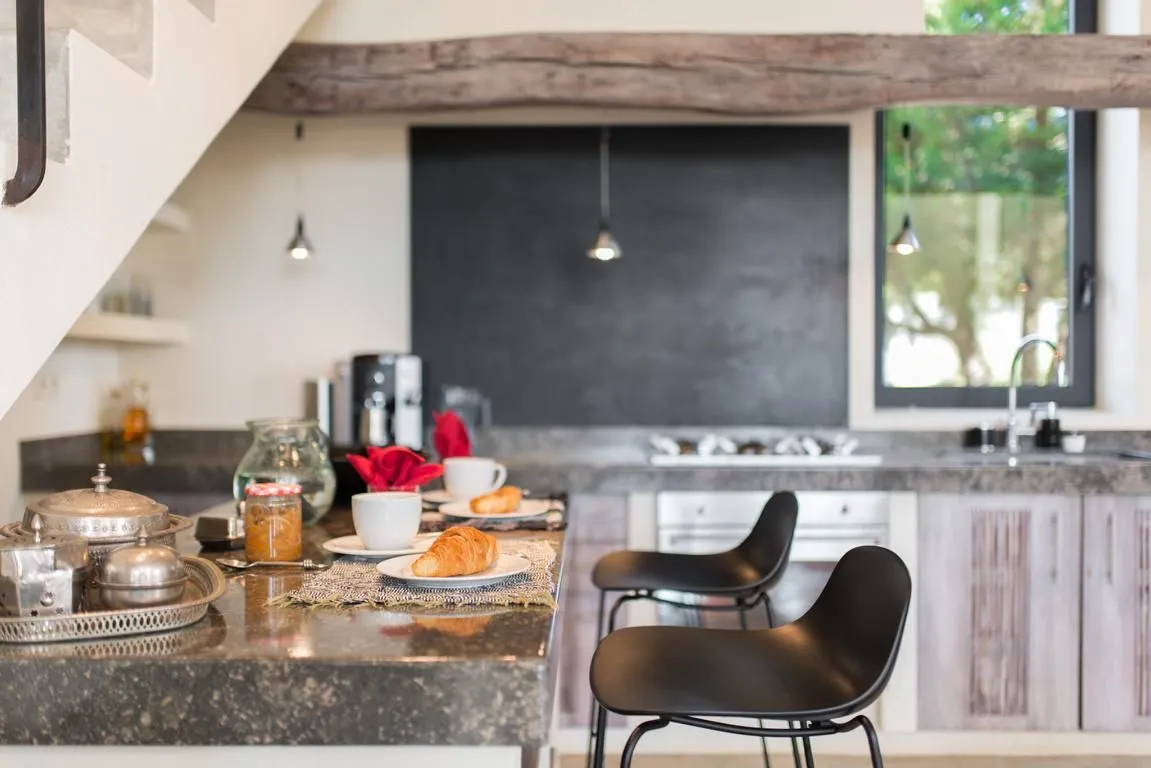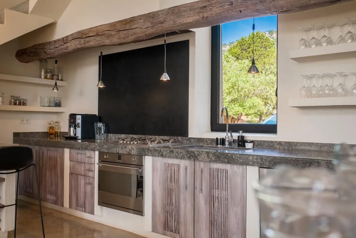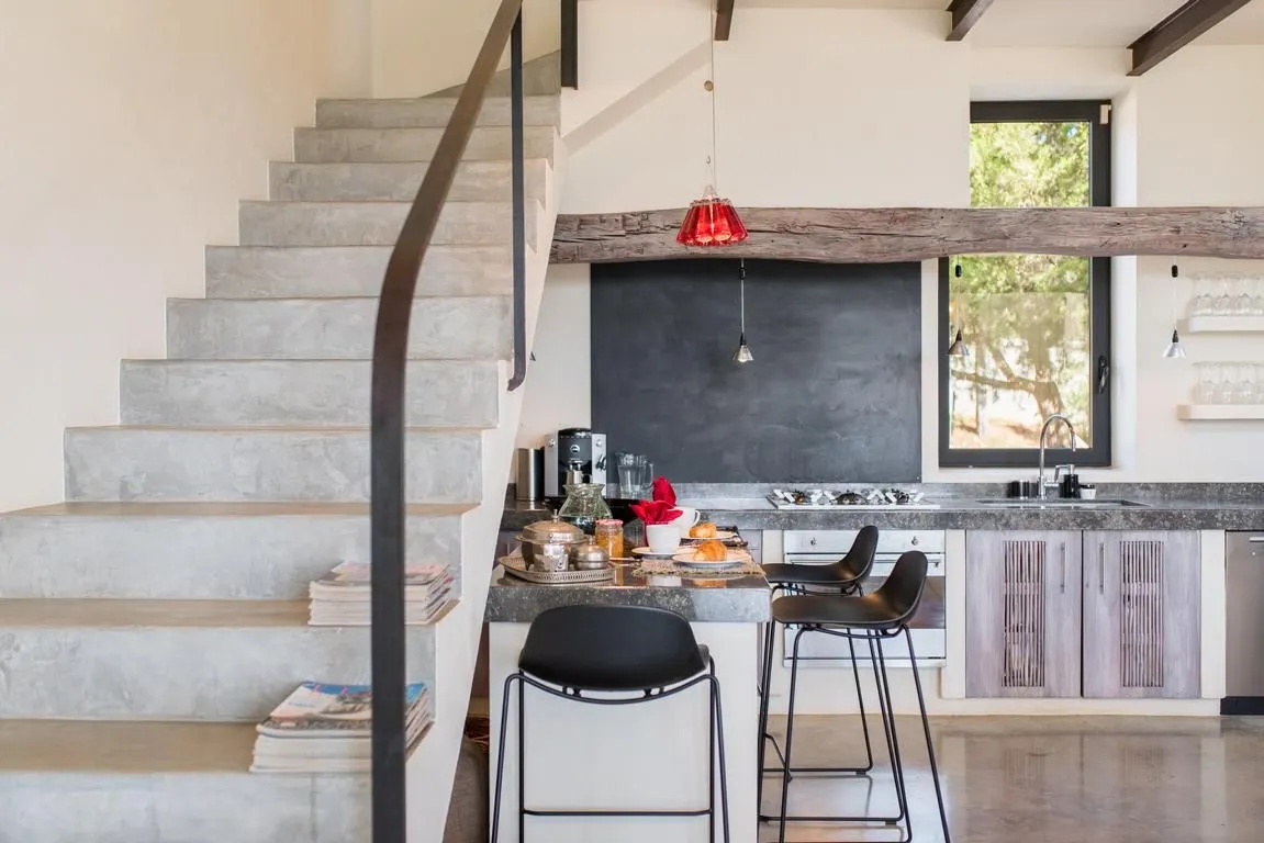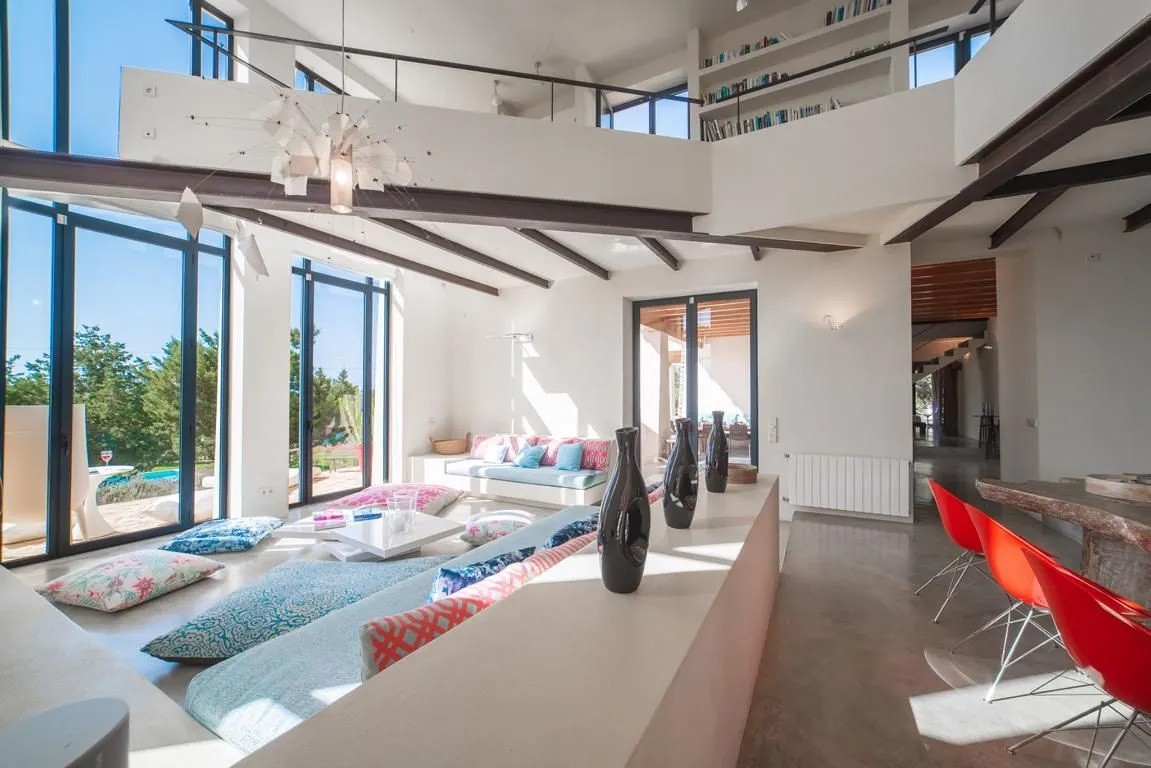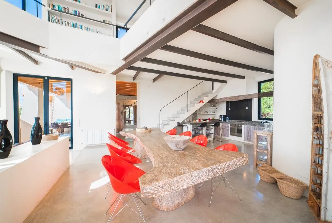 Die Innenräume sind offen, lichtdurchflutet und von hoher ästhetischer Qualität geprägt. Herzstück ist der doppelstöckige Wohnbereich mit Galerie, der mit sorgfältig kuratierter Kunst, eklektischen Dekorationen und gemütlichen Design‑Möbeln ausgestattet ist. Dieser Bereich geht fließend in den Essbereich mit großer, stilvoller Speisetafel sowie in die offene, voll ausgestattete Küche über – perfekt für gesellige Abende ebenso wie für formelle Dinner.
