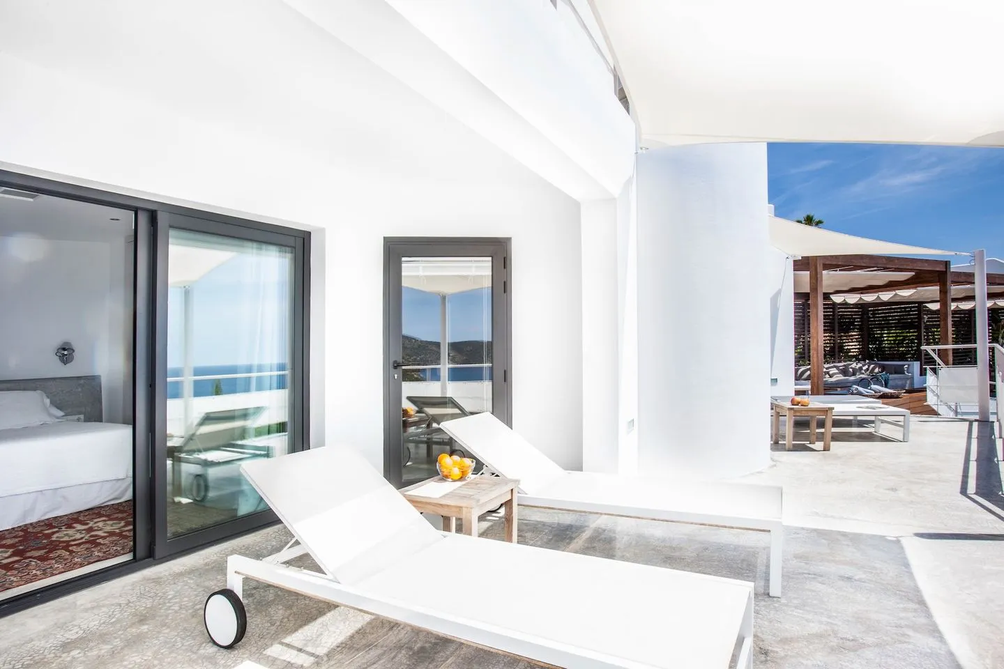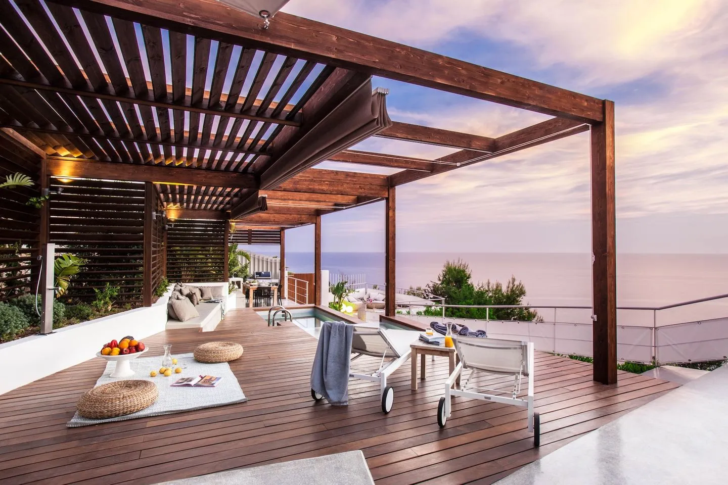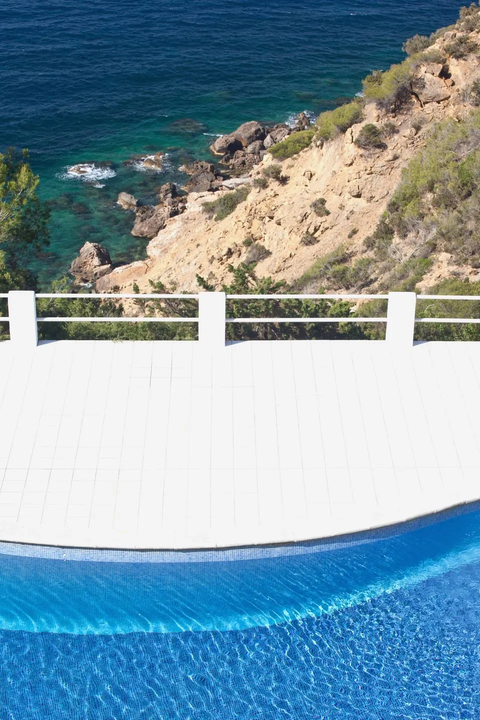 Der Außenbereich ist vielseitig gestaltet und verbindet Komfort mit spektakulärer Lage. Ein kinderfreundlicher privater Pool mit Essbereich im Freien ist über große Schiebetüren erreichbar. Zusätzlich verfügt die Villa über einen großen, frontseitig gelegenen Pool mit Sonnenterrasse, Liegen und schattierter Bar, der in die Klippen integriert ist und einen freien Blick auf das Mittelmeer eröffnet. Mehrere Terrassen mit Sitz‑ und Loungebereichen sowie flexible Beschattung sorgen für hohen Aufenthaltskomfort.