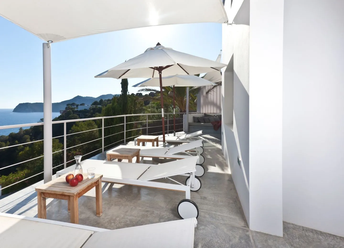 Auf der unteren Ebene befinden sich vier weitere Schlafzimmer, alle mit Bad en suite und direktem Zugang zu Terrassen mit Meerblick. Ergänzt wird dieser Bereich durch einen Kinoraum mit Surround‑Sound‑System, eine große Bar mit Stauraum sowie einen Essbereich, der sich ideal für geselliges Beisammensein eignet. Die Schlafzimmer sind großzügig geschnitten und bieten ausreichend Platz für längere Aufenthalte.
