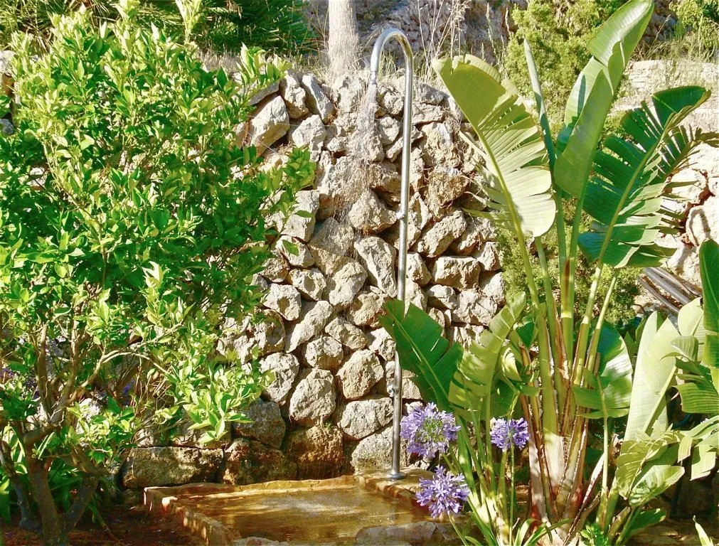 Der Außenbereich der Finca Tramuntana ist ebenso vielseitig wie beeindruckend. Die hochwertig möblierte Hauptterrasse bietet einen grandiosen Meerblick und lädt zu entspannten Stunden unter freiem Himmel ein. Über die terrassenförmig angelegte Gartenanlage verteilen sich mehrere Sitz‑ und Ruheplätze, teils überdacht, die unterschiedliche Perspektiven auf Meer, Küste und Berge eröffnen. Der Pool mit den Maßen 10 x 5 Meter ist mit einer Kindersicherung ausgestattet und von Sonnenliegen sowie schattigen Plätzen umgeben. Eine Außendusche, ein BBQ‑Häuschen, ein Kräutergarten, Obstbäume, mediterrane Bepflanzung und gepflegte Rasenflächen runden das Außenkonzept ab.