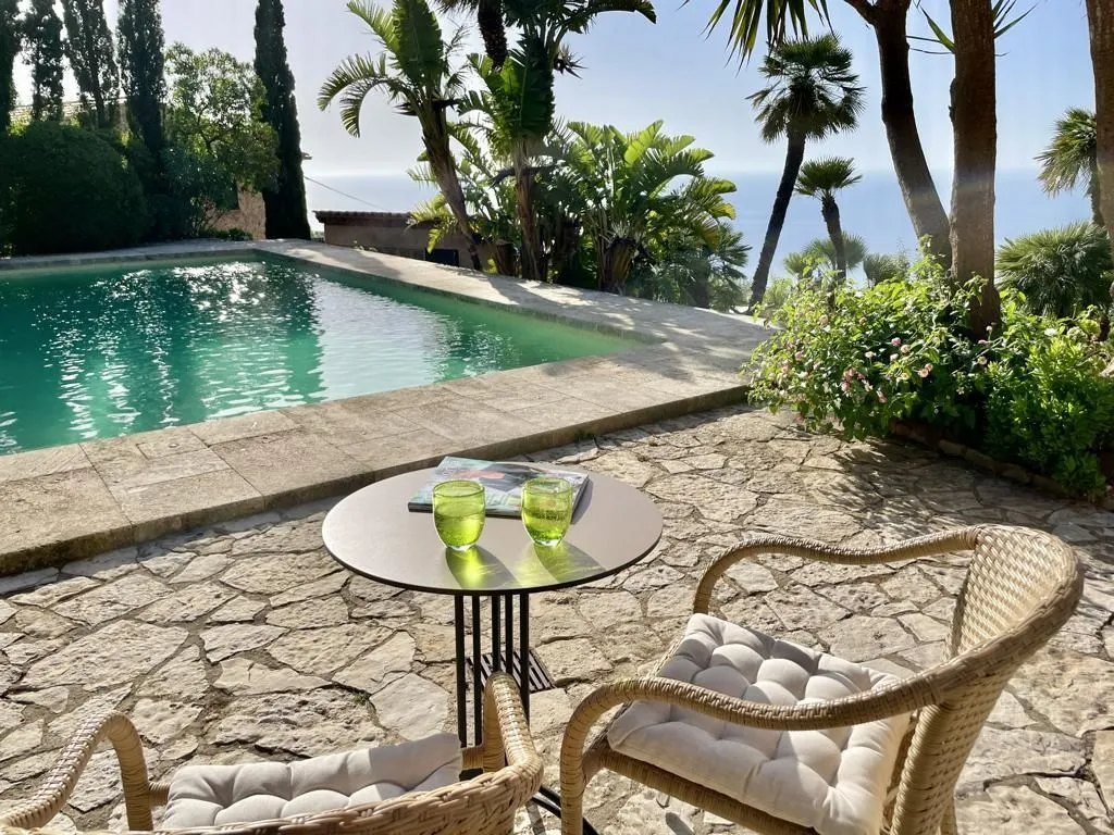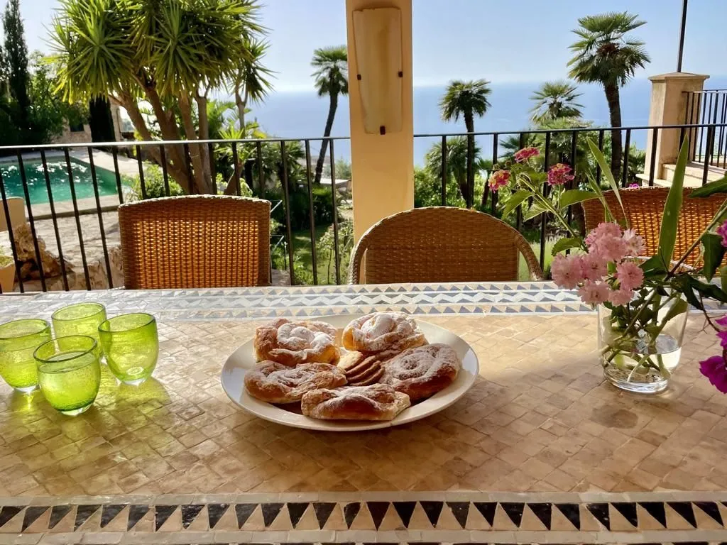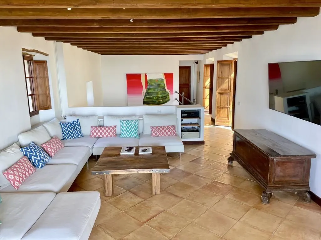 Die Finca erstreckt sich über zwei Etagen und liegt in einer gepflegten mediterranen Gartenanlage. Der großzügig gestaltete offene Wohn‑ und Essbereich mit offenem Kamin bildet das Herzstück des Hauses. Große Fensterfronten öffnen sich zur Terrasse und geben den Blick auf das Meer frei. Eine große Speisetafel bietet Platz für gemeinsame Mahlzeiten in eindrucksvoller Kulisse. Die hochwertige, professionell ausgestattete Küche lässt keine Wünsche offen und ist ideal für Gäste, die gerne gemeinsam kochen. Im oberen Stockwerk befindet sich eine zweite komfortable Lounge mit Satelliten‑TV – ein ruhiger Rückzugsort mit Blick in die umliegende Landschaft.