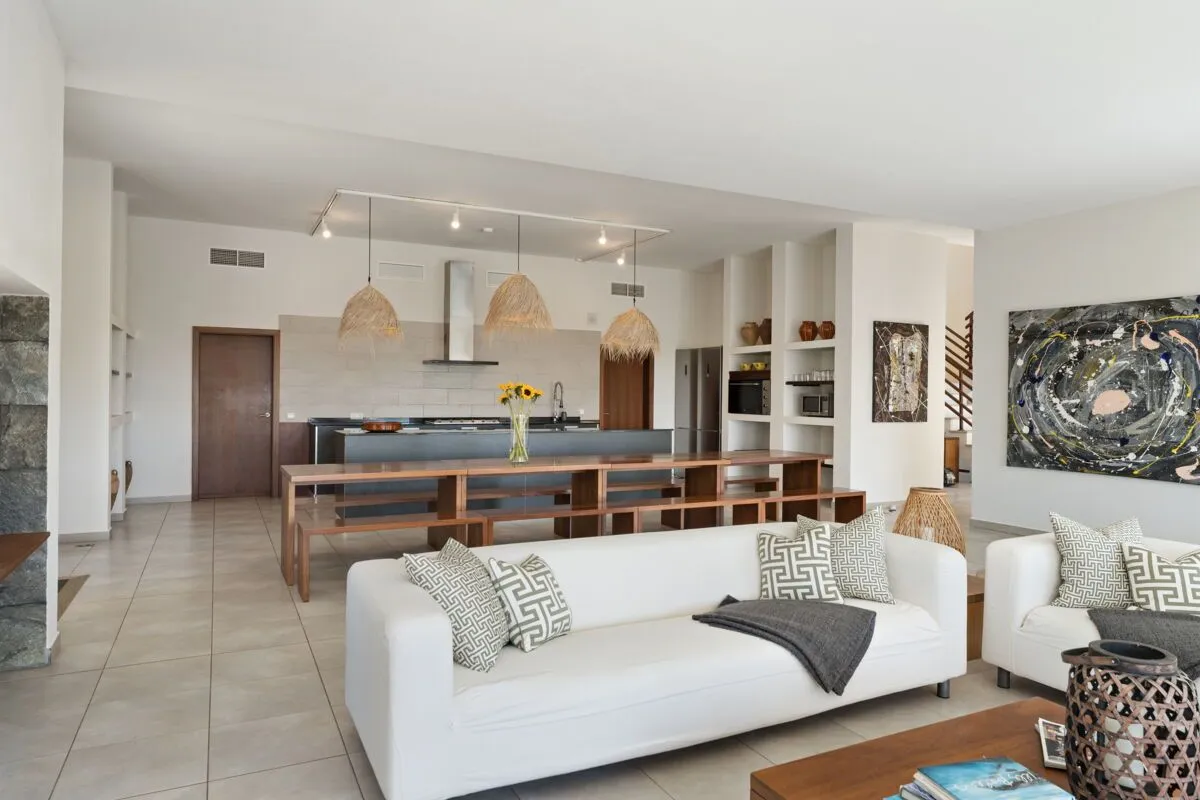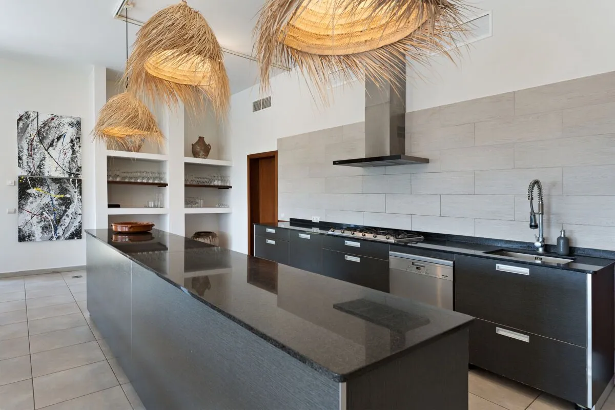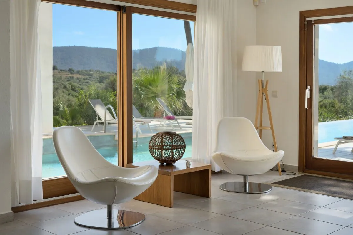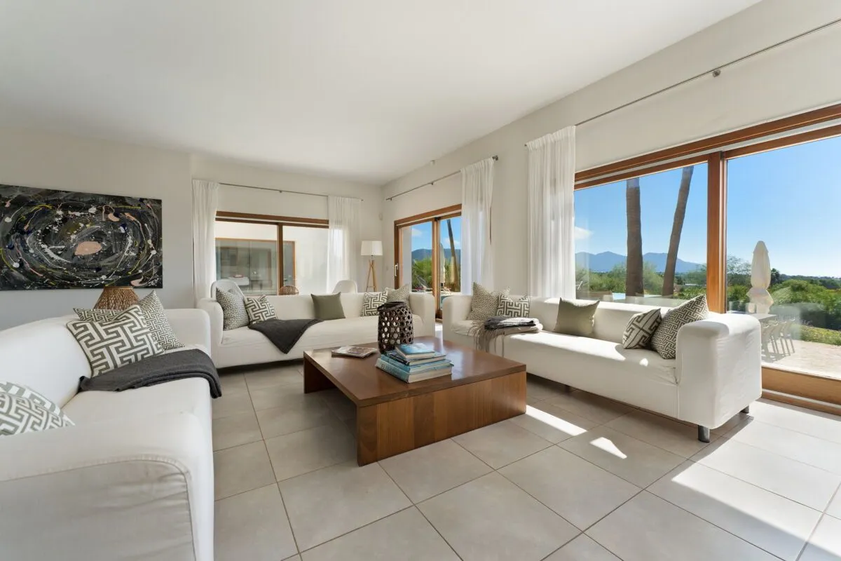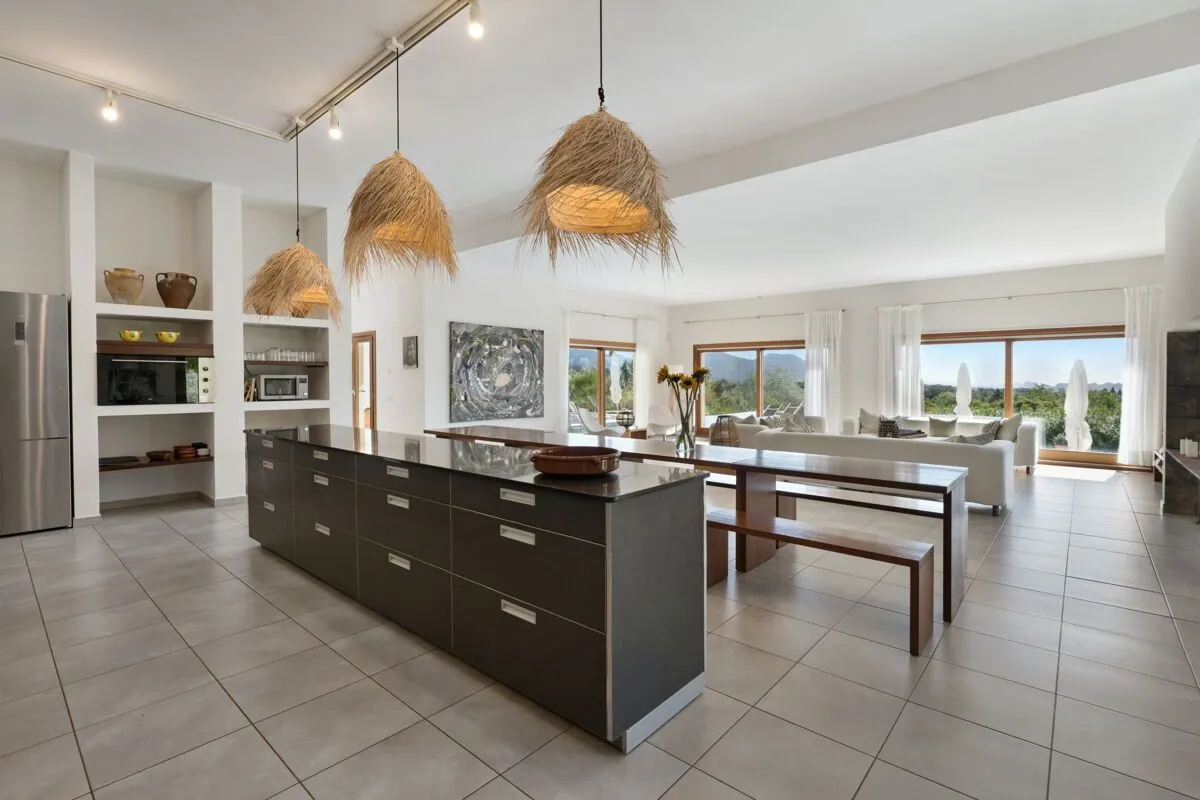 Im Inneren überzeugt die Finca Son Sard Mallorca mit einem lichtdurchfluteten, offen gestalteten Wohn‑ und Essbereich. Bodentiefe Fenster lassen viel Tageslicht herein und verbinden die Wohnräume harmonisch mit den Terrassen und dem Garten. Der großzügige Wohnraum geht fließend in den Essbereich mit großer Holzesstafel über und schafft ein stilvolles, zugleich einladendes Ambiente. Die moderne, voll ausgestattete Küche verfügt über hochwertige Geräte, darunter eine Nespresso‑Kaffeemaschine, Spülmaschine sowie zwei große Kühlschränke, und eignet sich ideal für gemeinsames Kochen und Genießen.