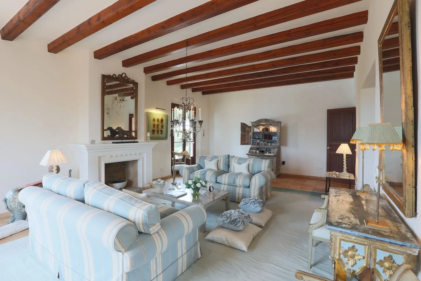 Im Inneren der Finca setzt sich der warme, authentische Stil fort. Der helle, großzügige Wohnbereich ist offen gestaltet und mit einem Kamin, antiken Möbeln und stilvollen Kronleuchtern ausgestattet, die eine besonders gemütliche Atmosphäre schaffen. Große Fenster sorgen für viel Tageslicht und verbinden Innen‑ und Außenbereich harmonisch miteinander.