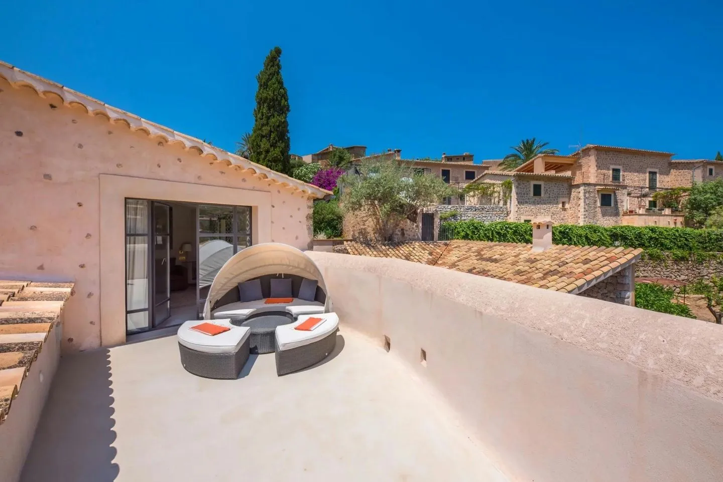 Zwei Terrassen prägen den Außenbereich der Finca Ramon Deià. Die obere Terrasse bietet erhöhte Ausblicke über Deià und eignet sich ideal für ein Frühstück in ruhiger Atmosphäre oder ein Abendessen bei Sonnenuntergang. Die zweite Terrasse mit Infinity‑Pool eröffnet einen eindrucksvollen Blick über die Dächer des Dorfes, auf die Gärten des renommierten Hotels La Residencia sowie auf die markanten Gipfel der Tramuntana. Daybeds, Essbereiche im Freien und ruhige Sitzplätze machen diesen Bereich zum Mittelpunkt des Hauses.
