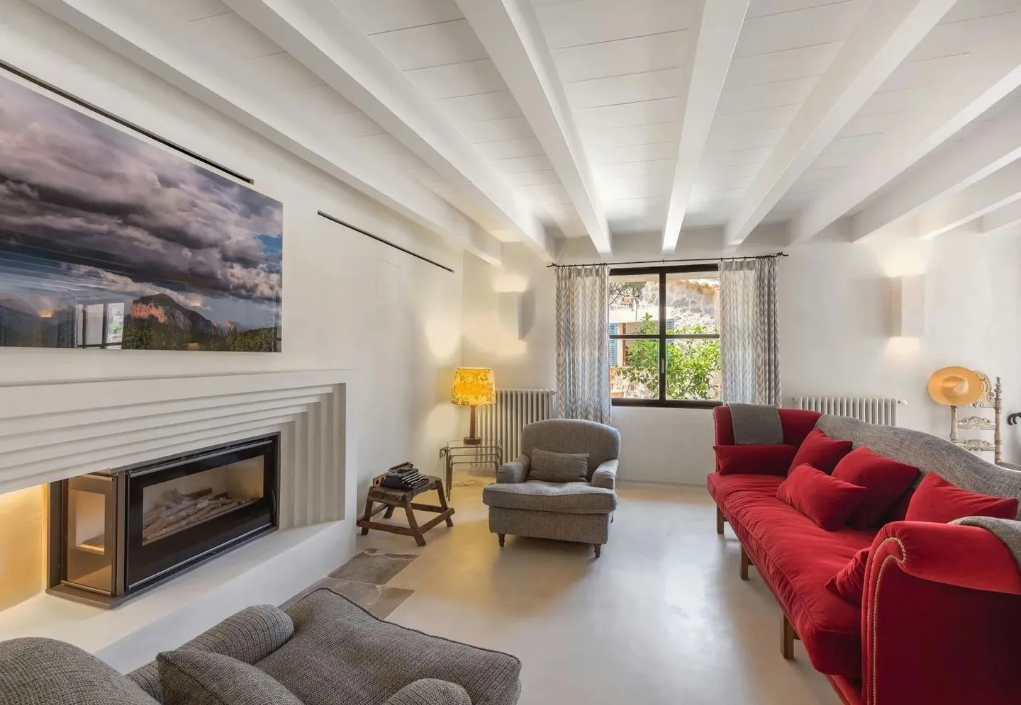 Im Inneren überzeugt die Finca Ramon Deià mit einem großzügigen, offen gestalteten Wohnkonzept. Der moderne Wohn‑, Ess‑ und Küchenbereich ist lichtdurchflutet und stilvoll eingerichtet. Die voll ausgestattete Küche fügt sich nahtlos in den offenen Grundriss ein und schafft ideale Voraussetzungen für gemeinsame Mahlzeiten. Ein Kamin sowie ein hochwertiger Medien‑ und TV‑Bereich sorgen für zusätzlichen Komfort und eine angenehme Atmosphäre.