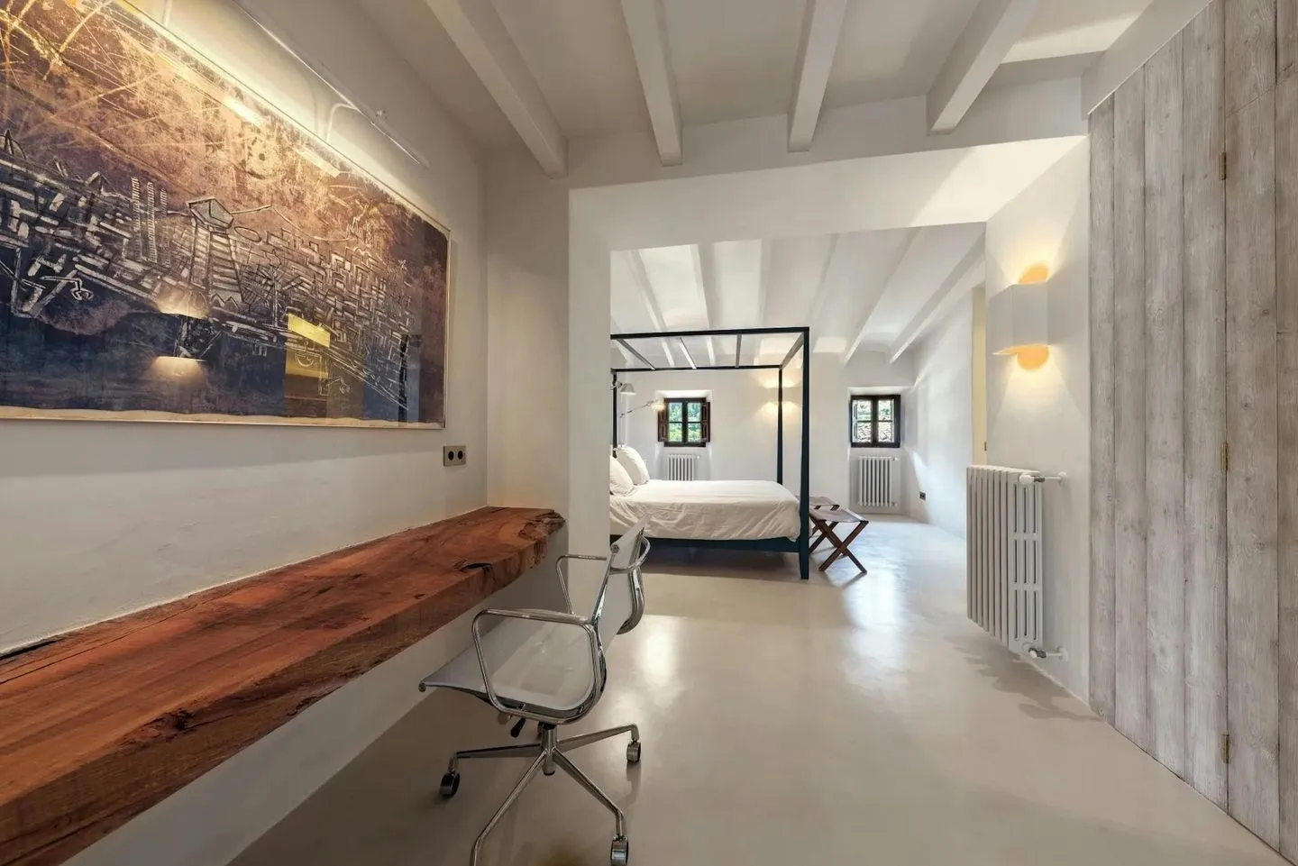 Die Finca Ramon Deià bietet Platz für bis zu acht Gäste und verfügt über vier geschmackvoll eingerichtete Schlafzimmer, alle mit eigenem Bad en suite. Das Master‑Schlafzimmer im Obergeschoss ist mit einem großzügigen Bett, TV sowie einem luxuriösen Badezimmer mit freistehender Badewanne und begehbarer Dusche ausgestattet und bietet einen schönen Blick auf Dorf und Berglandschaft. Drei weitere Schlafzimmer befinden sich im Erdgeschoss, zwei davon mit direktem Zugang zur Poolterrasse. Ein Schlafzimmer ist mit zwei Einzelbetten ausgestattet und eignet sich ideal für Freunde oder ältere Kinder. Zusätzlich steht ein Arbeits‑ bzw. Studierzimmer mit hochwertigem Schlafsofa zur Verfügung.