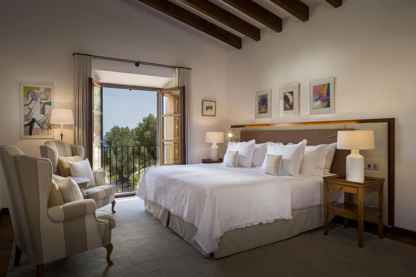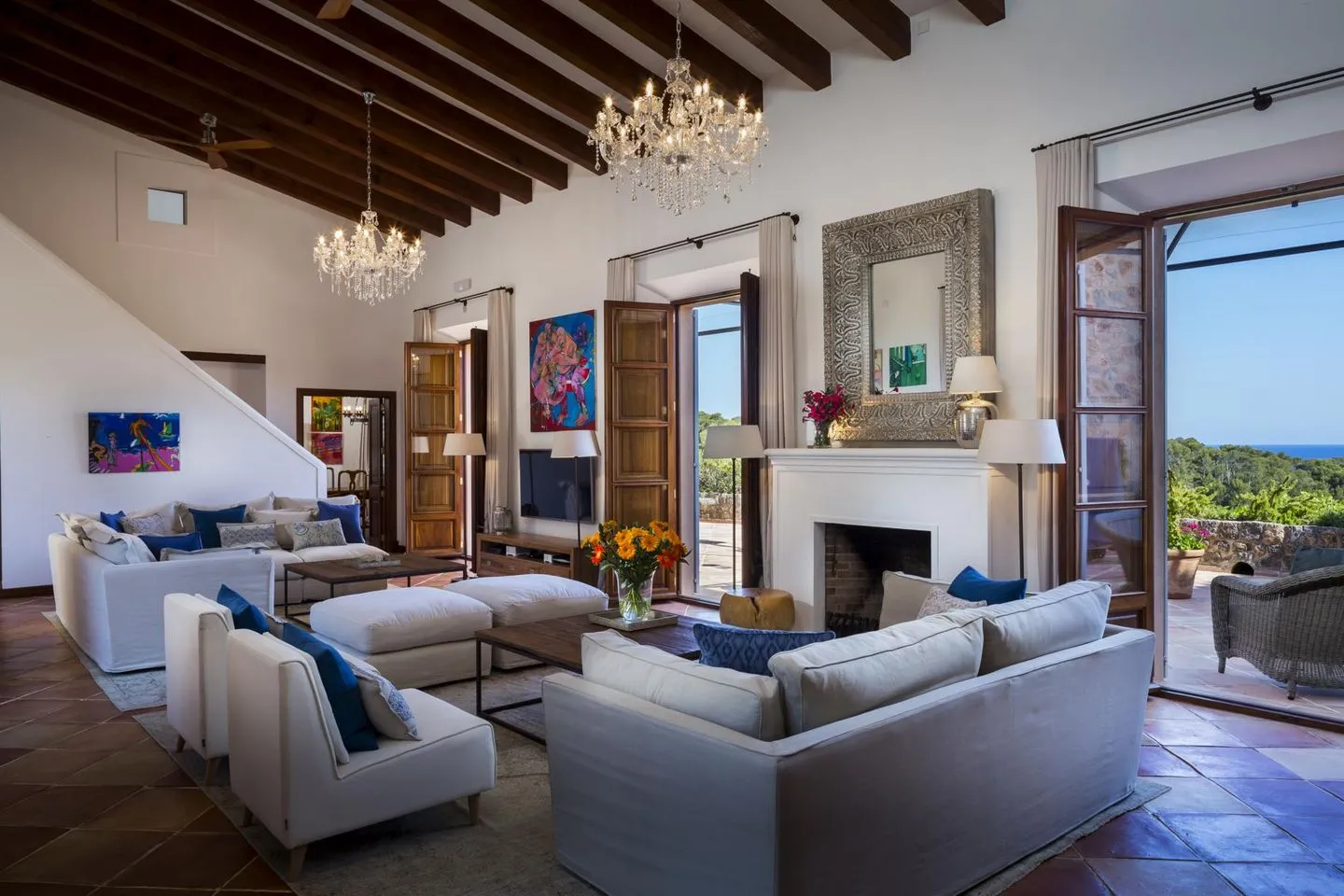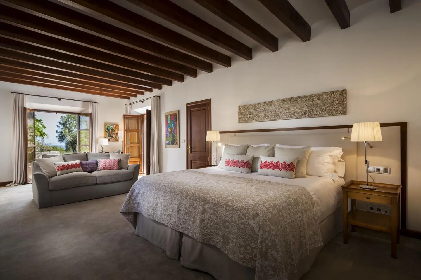 Der Name „Sa Terra Rotja“ bedeutet im Mallorquinischen „Rote Erde“ und spiegelt den authentischen Charakter der Region wider. Die Villa verfügt über vier großzügige Schlafzimmer und bietet Platz für bis zu acht Gäste. Herzstück ist die elegante Master Suite (ca. 28 m²) mit Kingsize-Bett, atemberaubendem Meerblick, einem großzügigen Bad en suite mit freistehender Badewanne, Schreibtisch, gemütlicher Leseecke sowie einem charmanten kleinen Fenster mit Blick in den Wohnbereich.