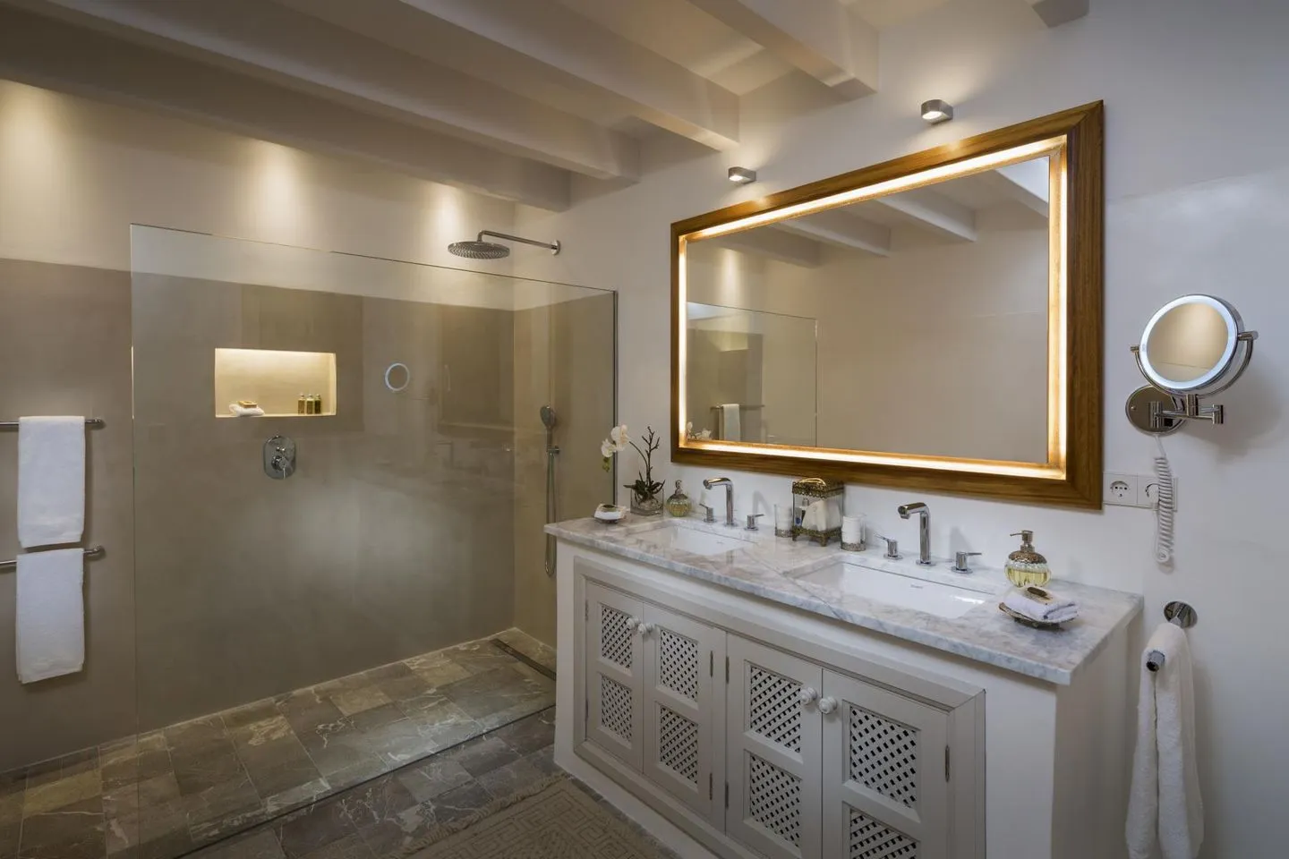 Die drei weiteren Gästezimmer sind ebenfalls mit Kingsize-Betten, jeweils eigenem Bad en suite und komfortablen Sitz- oder Loungebereichen ausgestattet. Große Fenster eröffnen spektakuläre Ausblicke auf das Meer und die umliegende Berglandschaft. Zur Zimmerausstattung gehören Haartrockner, BOSE Mini‑Speaker, Safe in Laptopgröße, USB‑Anschlüsse und Adapter, TV sowie hochwertige Bad‑Amenities.