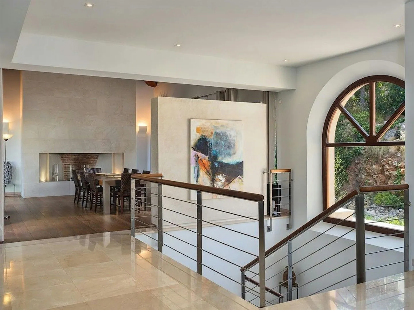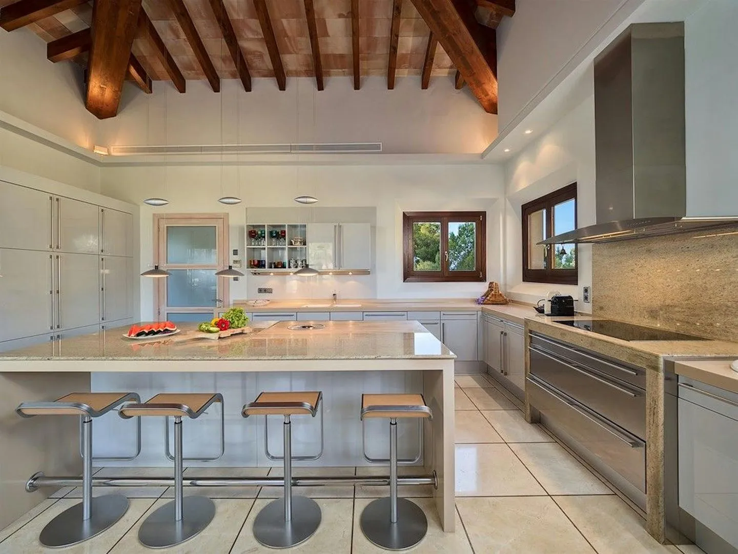 Architektur und Bauqualität der Villa Coral Mallorca sind auf höchste Ansprüche ausgerichtet. Der offen gestaltete Wohn‑ und Essbereich mit bis zu sechs Meter hoher Decke und sichtbaren Holzbalken vermittelt ein großzügiges, lichtdurchflutetes Raumgefühl. Auf der oberen Wohnebene befinden sich der repräsentative Eingangsbereich, zwei stilvolle Wohnsalons mit Kamin, ein großzügiger Essbereich mit Kamin sowie eine moderne Markenküche mit hochwertiger Ausstattung. Eine separate Speisekammer mit Weinkühlschrank und ein Gäste‑WC ergänzen diese Ebene. Auf der Meerseite umschließt eine überdachte Terrasse das Haus und bietet verschiedene Sitzbereiche sowie eine große Speisetafel für lange Abende mit Blick auf das Meer.