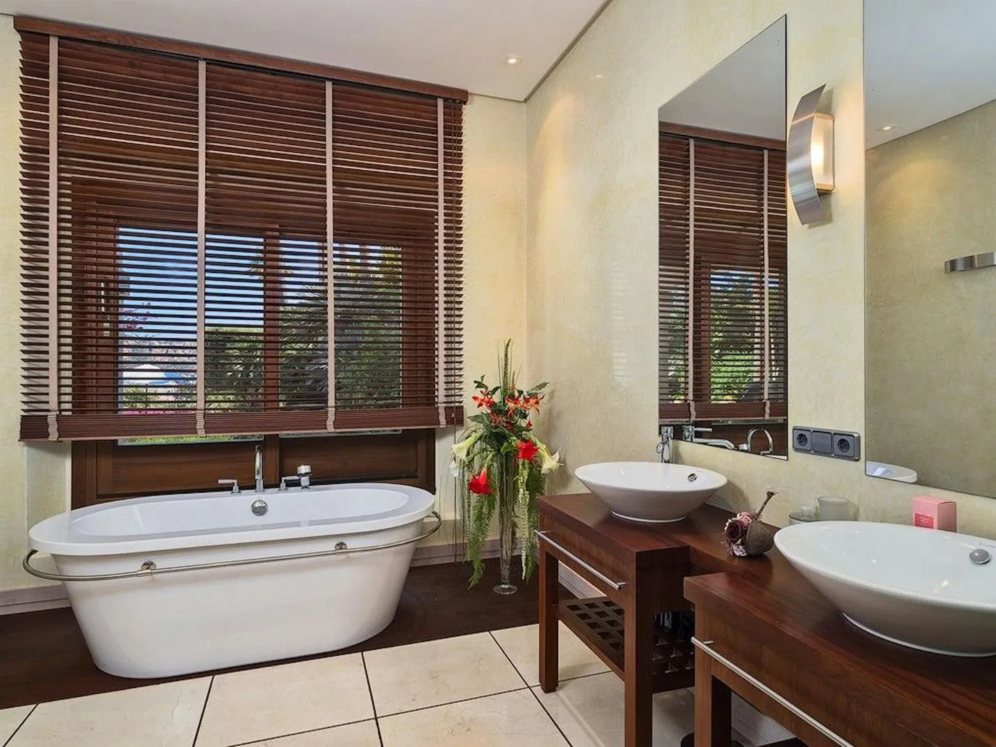 Die untere Wohnebene ist dem privaten Wohnen vorbehalten. Hier befinden sich drei großzügige Schlafzimmer, jeweils mit Kingsize‑Bett, Klimaanlage und luxuriösem Bad en suite mit Dusche und Badewanne. Die Master‑Suite verfügt zusätzlich über einen Ankleidebereich sowie direkten Zugang zum Garten‑ und Poolbereich. Auch die beiden weiteren Schlafzimmer öffnen sich direkt zur Poolterrasse. Ein separater TV‑Raum sowie ein Hauswirtschaftsraum sorgen für zusätzlichen Komfort.