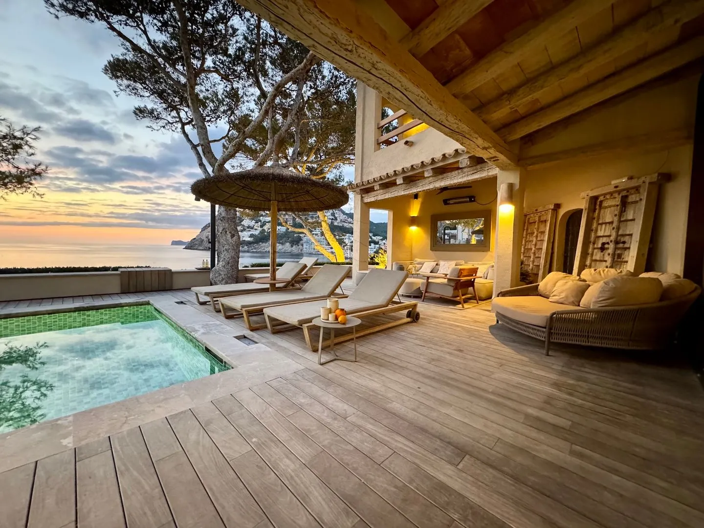 Der Außenbereich dieser Luxus Finca ist ein echtes Highlight. Der große Pool mit Blick auf das Meer bietet Erfrischung an warmen Tagen, während zahlreiche Lounge‑ und Sitzbereiche kleine Rückzugsorte schaffen, um den Alltag hinter sich zu lassen. Besonders eindrucksvoll sind die Sonnenuntergänge, wenn die Sonne langsam im Meer versinkt und die Villa in warmes Licht taucht. Ein Glas Wein, der Blick aufs Wasser und absolute Ruhe – genau dafür steht die Finca Las Madrugadas.