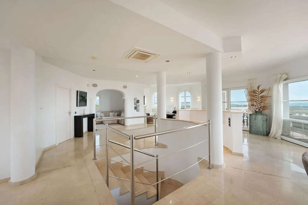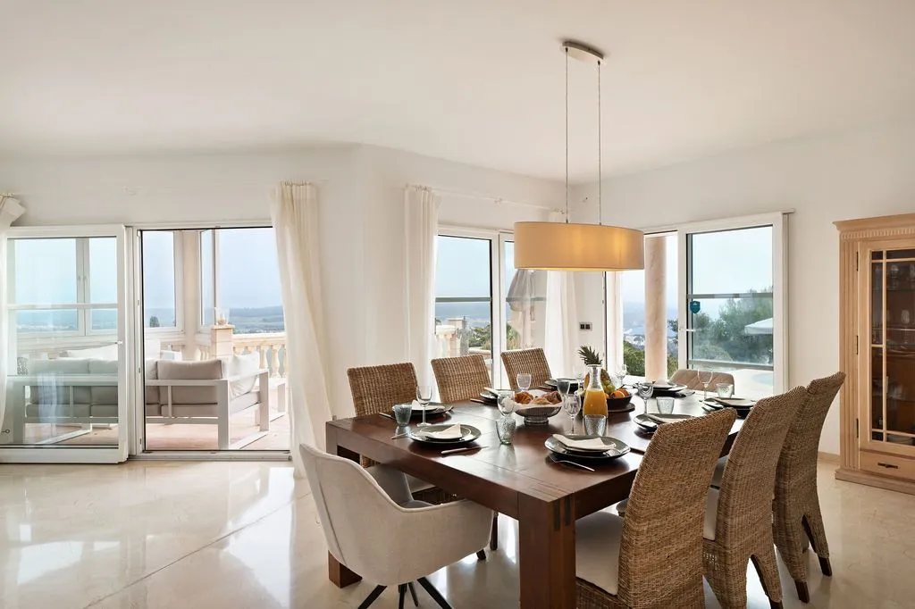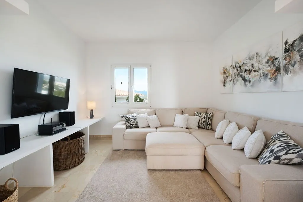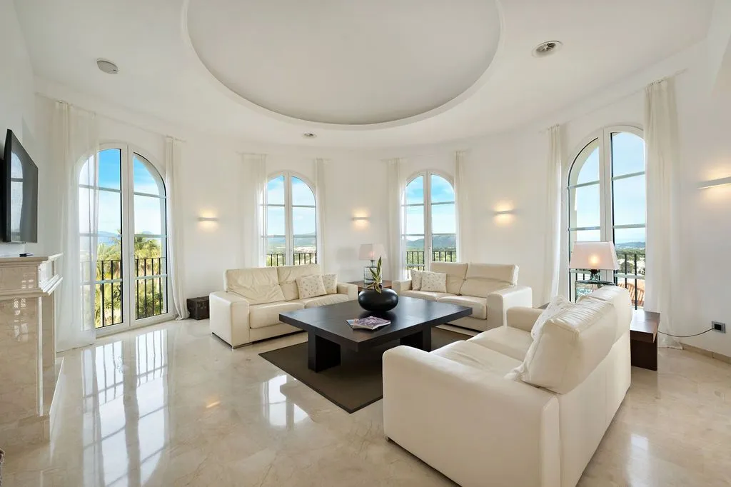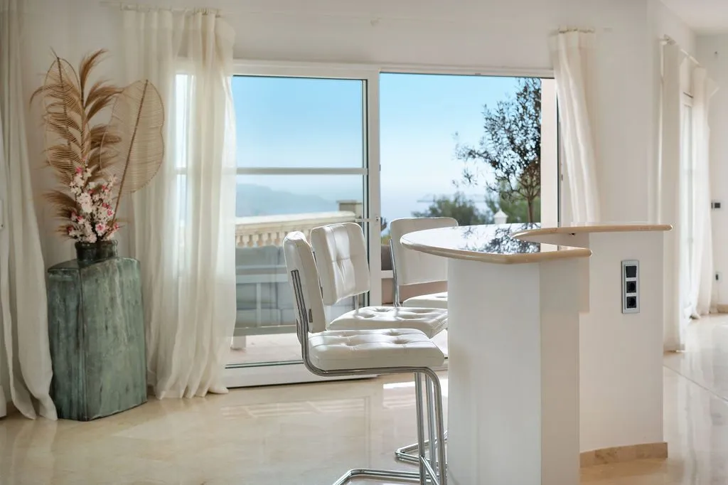 Die Architektur der Finca ist darauf ausgelegt, den spektakulären Blick vollständig zu integrieren. Hohe Decken, große Panoramafenster und lichtdurchflutete Räume schaffen eine offene, elegante Atmosphäre, die den mediterranen Lebensstil perfekt widerspiegelt. Der großzügige Wohnbereich im oberen Geschoss kombiniert Essbereich, Lounge und Küche zu einem harmonischen, weitläufigen Raum, der direkt auf die große Meerblick‑Terrasse führt. Hier entsteht ein Gefühl völliger Freiheit, während das Meer in all seinen Blautönen und die umliegende Landschaft wie ein lebendiges Gemälde wirken. Eine separate TV‑Lounge bietet zusätzlichen Komfort und Rückzugsmöglichkeiten.