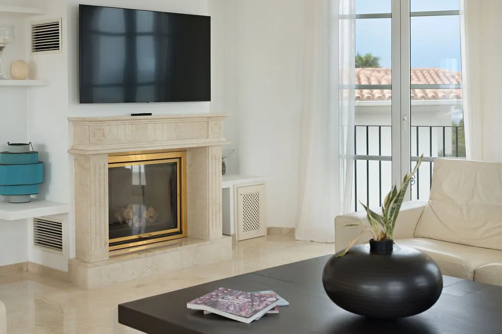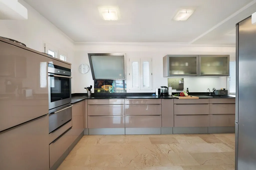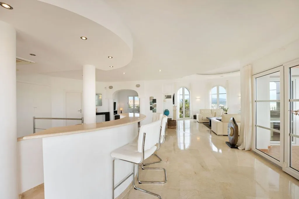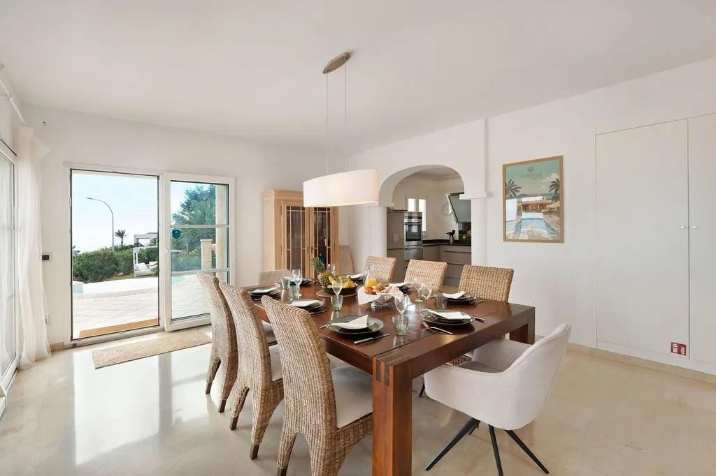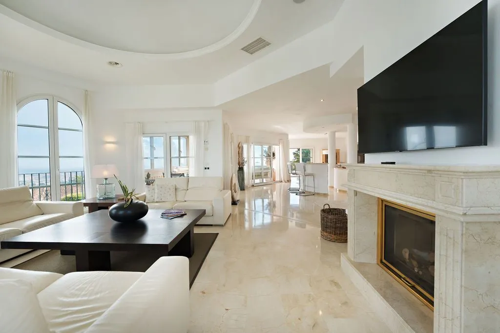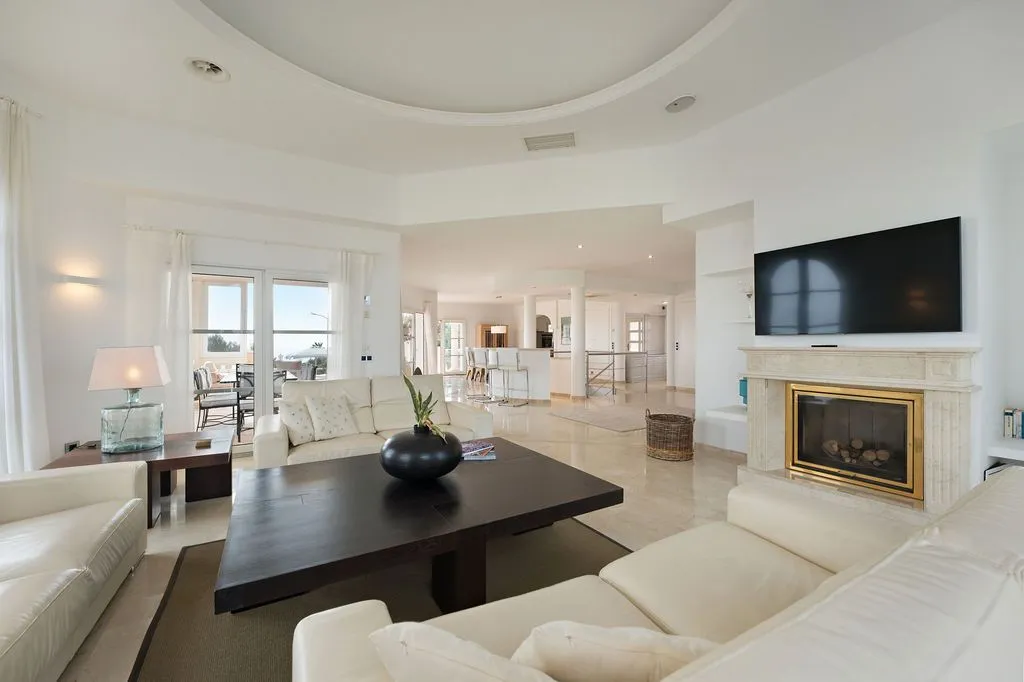 Die Architektur der Finca ist darauf ausgelegt, den spektakulären Blick vollständig zu integrieren. Hohe Decken, große Panoramafenster und lichtdurchflutete Räume schaffen eine offene, elegante Atmosphäre, die den mediterranen Lebensstil perfekt widerspiegelt. Der großzügige Wohnbereich im oberen Geschoss kombiniert Essbereich, Lounge und Küche zu einem harmonischen, weitläufigen Raum, der direkt auf die große Meerblick‑Terrasse führt. Hier entsteht ein Gefühl völliger Freiheit, während das Meer in all seinen Blautönen und die umliegende Landschaft wie ein lebendiges Gemälde wirken. Eine separate TV‑Lounge bietet zusätzlichen Komfort und Rückzugsmöglichkeiten.
