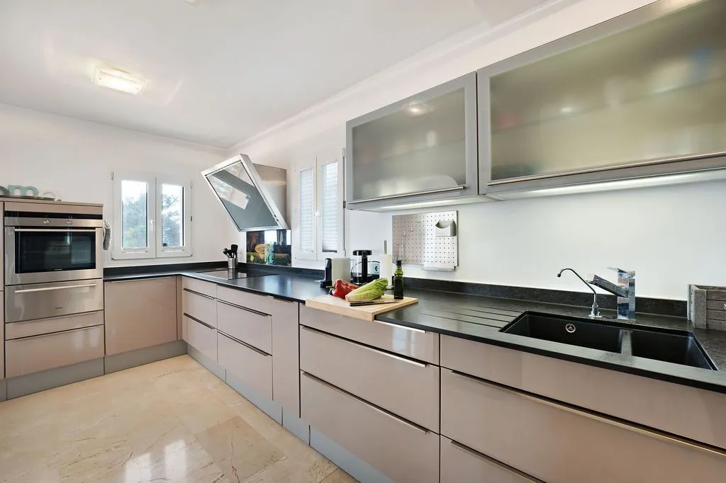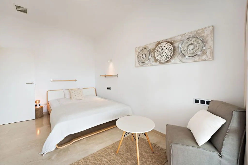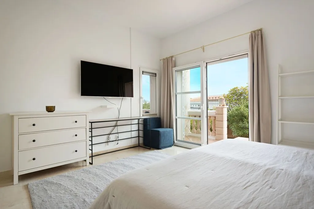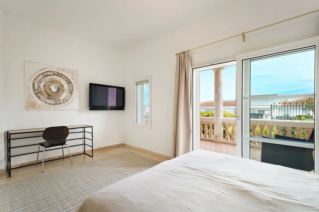 Die moderne Küche ist mit hochwertigen Geräten ausgestattet und fügt sich stilvoll in das Gesamtbild ein. Ein Gäste‑WC ergänzt das Raumangebot auf dieser Ebene inklusive Duschkabine. Im Untergeschoss befinden sich vier Doppelschlafzimmer, die alle einen besonders ruhigen Charakter besitzen und direkten Zugang zur unteren Terrasse bieten. Zwei große Familienbäder sorgen für Komfort und Privatsphäre. Alle Schlafzimmer sind klimatisiert und so positioniert, dass sie ebenfalls die besondere Lage der Finca spürbar machen.