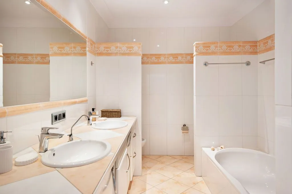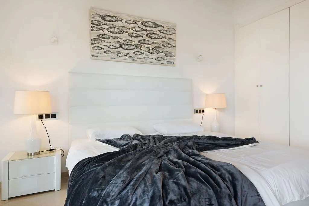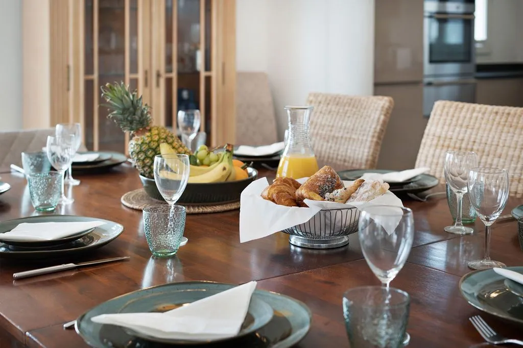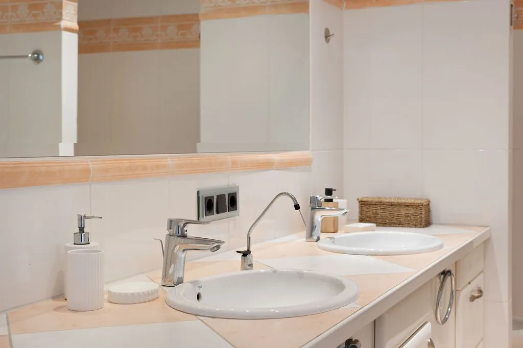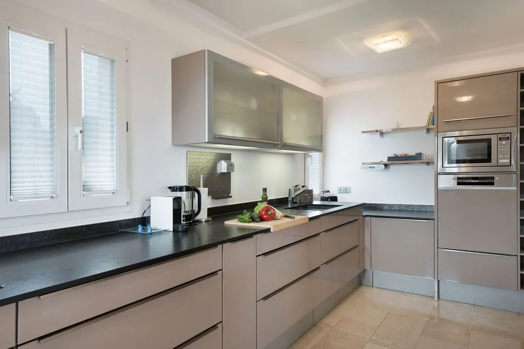 Die moderne Küche ist mit hochwertigen Geräten ausgestattet und fügt sich stilvoll in das Gesamtbild ein. Ein Gäste‑WC ergänzt das Raumangebot auf dieser Ebene inklusive Duschkabine. Im Untergeschoss befinden sich vier Doppelschlafzimmer, die alle einen besonders ruhigen Charakter besitzen und direkten Zugang zur unteren Terrasse bieten. Zwei große Familienbäder sorgen für Komfort und Privatsphäre. Alle Schlafzimmer sind klimatisiert und so positioniert, dass sie ebenfalls die besondere Lage der Finca spürbar machen.