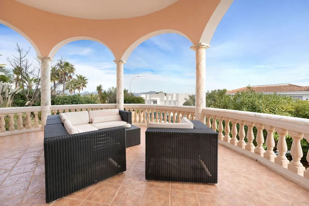 Der Außenbereich ist darauf ausgelegt, den außergewöhnlichen Ausblick in jeder Perspektive zu genießen. Eine weitläufige Terrasse bietet verschiedene schattige und sonnige Sitzbereiche, eine BBQ‑Zone, gemütliche Chill‑out‑Möbel und viel Raum zum Entspannen. Die Poolterrasse mit Sonnenliegen, Gartenbereich und Tagesbett schafft ein luxuriöses Outdoor‑Ambiente. Der private Pool liegt so, dass die Aussicht auch hier allgegenwärtig ist und die Stimmung von Sonnenaufgang bis Sonnenuntergang begleitet wird. Der mediterrane Garten ist gepflegt, harmonisch angelegt und unterstreicht die ruhige, exklusive Atmosphäre des Anwesens. Eine Garage mit direktem Zugang zur Finca sorgt für zusätzlichen Komfort.