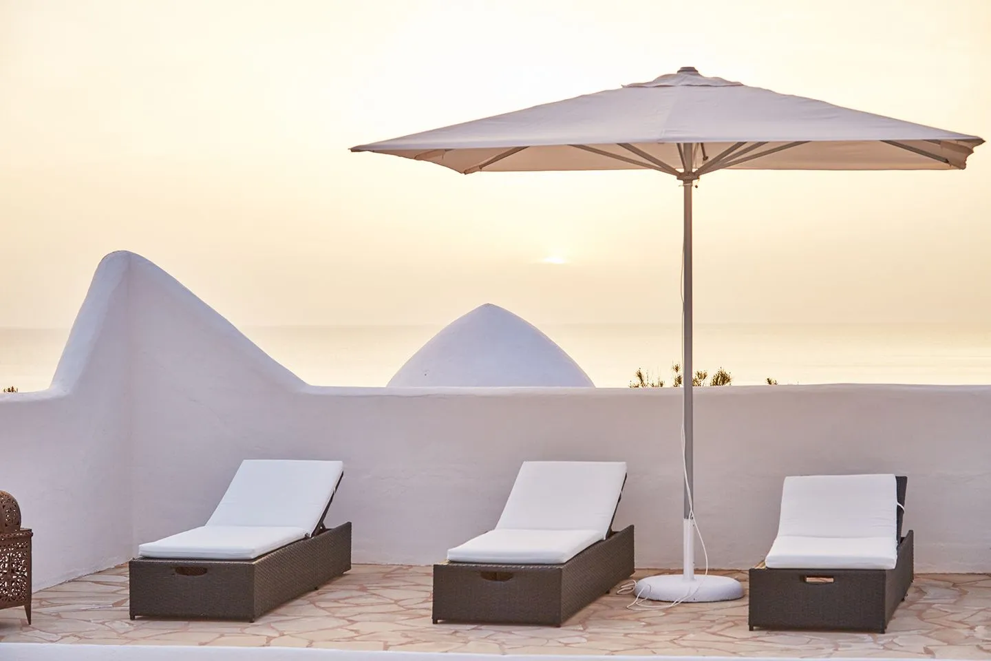 The architecture and interiors are inspired by a calm, Moroccan‑influenced design that creates a warm and relaxing ambiance. Natural materials, soft tones and clean lines turn the villa into a stylish hideaway for guests seeking peace and comfort. From the terraces, you can enjoy sunshine throughout the day and unforgettable sunsets over the sea in the evening.