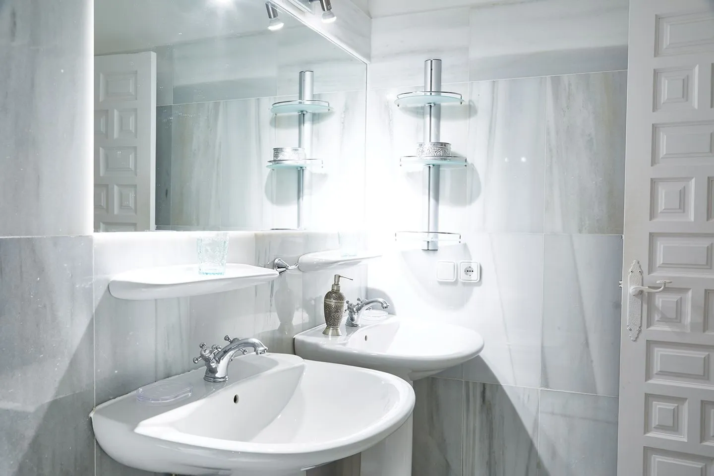 Inside, the villa features three double bedrooms and one single bedroom, all equipped with air conditioning. One bedroom has an en‑suite bathroom, complemented by two additional bathrooms. The fully equipped kitchen connects directly to the dining area with a large table. Satellite TV, central heating and a modern Bose sound system ensure comfort throughout the year.