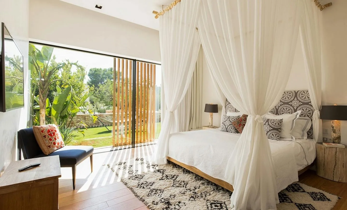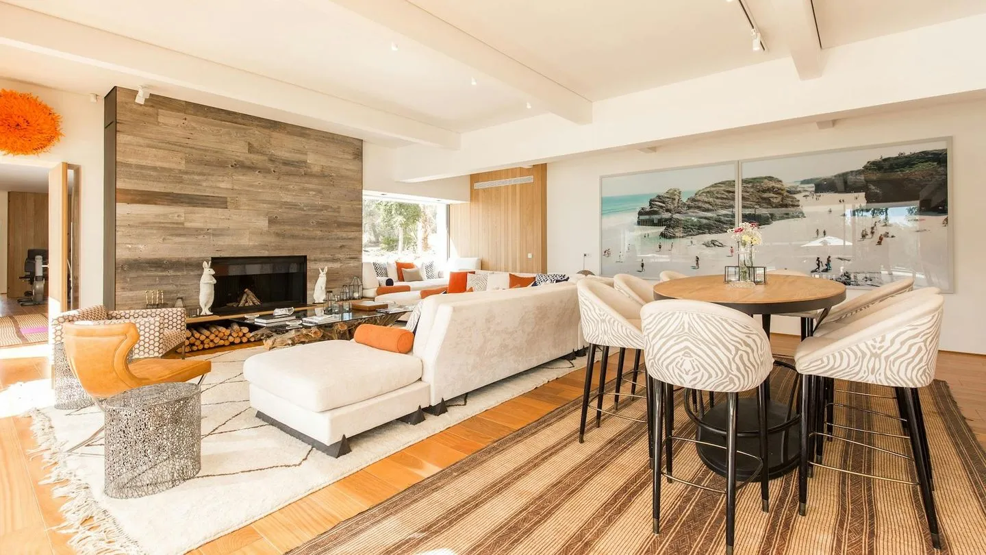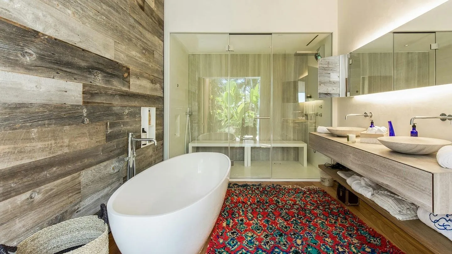 Inside, the villa combines contemporary design with warm materials such as polished wooden floors, creating an inviting and comfortable atmosphere despite its clean architectural style. The property features five bright and spacious double bedrooms, all with en‑suite bathrooms, air conditioning, TV, and high‑end sound systems. Each bedroom offers a high level of privacy and direct access to terraces or outdoor areas. The master suite additionally features a fireplace, hammam, bathtub, outdoor shower, and direct access to the jacuzzi and a private chill‑out area.