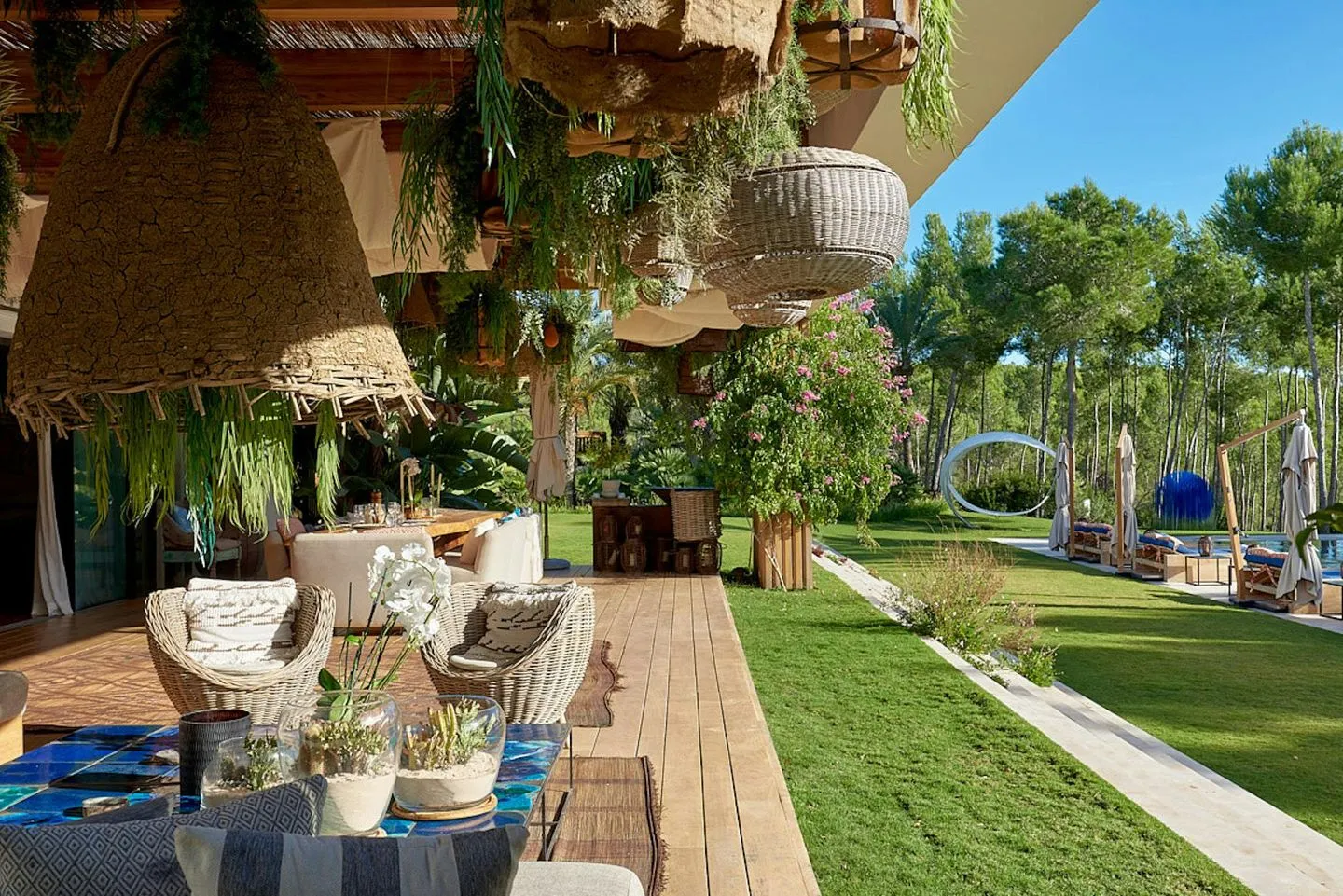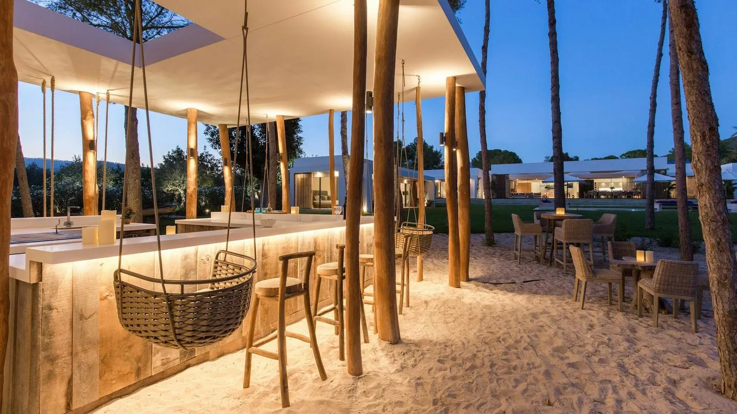 At the heart of the property lies the approximately 25‑meter infinity pool, supplied by the villa’s own private well and heatable during the winter months. All living and sleeping areas enjoy direct views over the pool. The expansive outdoor grounds offer several lounge and entertainment areas, including a large outdoor jacuzzi for up to ten guests, a pétanque court, and a unique open‑air cinema. A generous terrace with lounge seating and a large dining table connects the pool area to a private white‑sand zone beneath pine trees, designed as an additional outdoor living space with bar and seating areas.