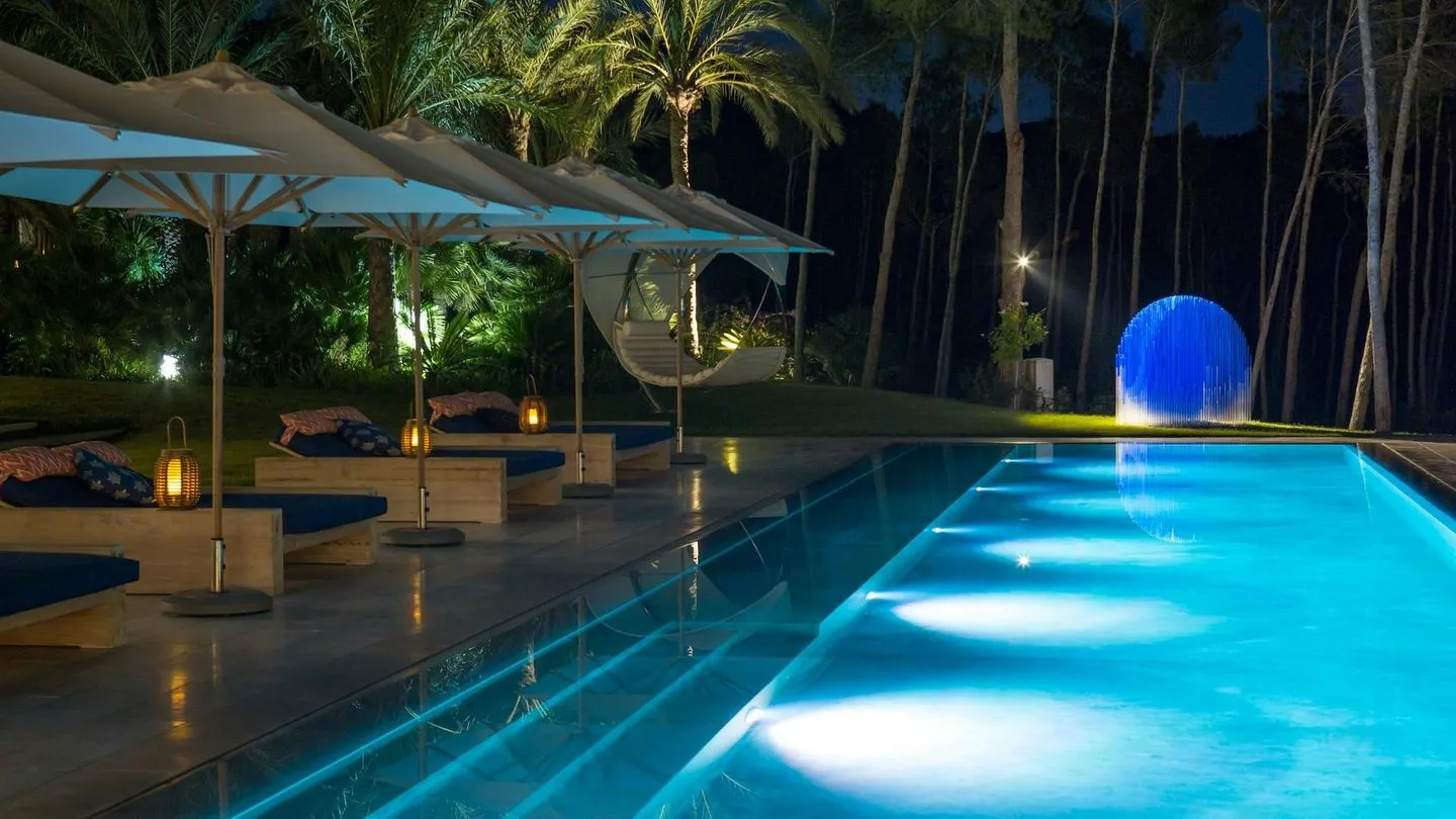 Villa Moderna Ibiza is an architecturally striking modern villa set in a quiet and secluded location in the south of Ibiza, between San José and the renowned beach of Cala Jondal, home to the famous Blue Marlin Ibiza. Clean lines and minimalist architecture are harmoniously complemented by the natural surroundings of tall pine trees, palm trees, and manicured lawns, creating a feeling of exclusive privacy.