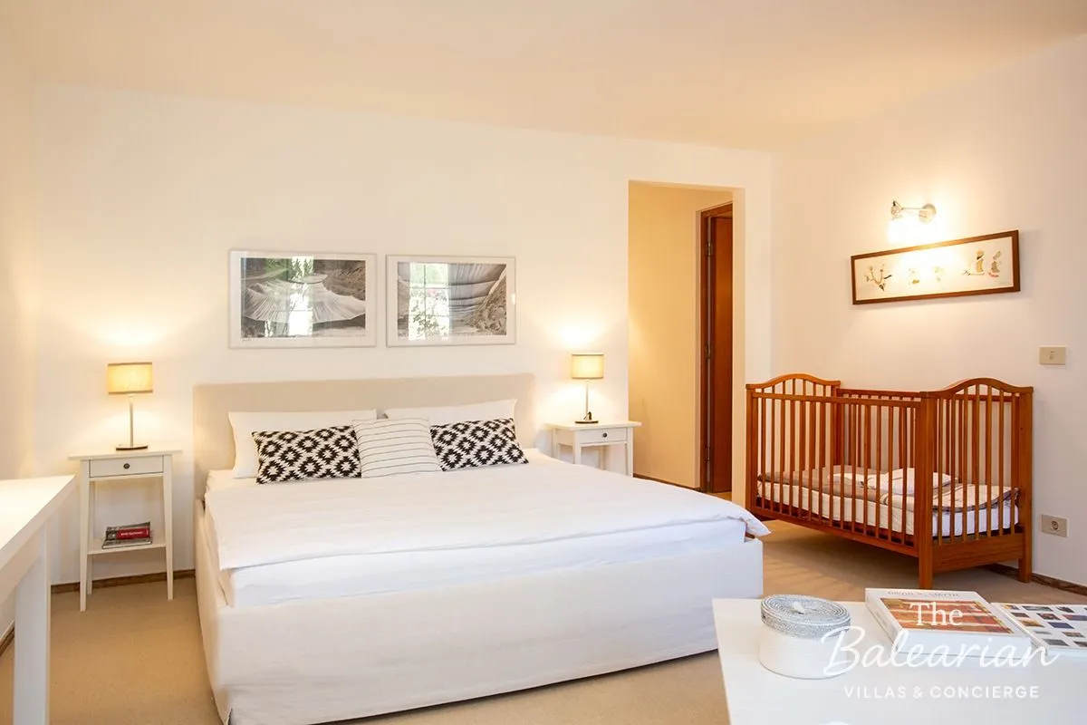 On the opposite side of the patio are two bedrooms with en‑suite shower rooms. Two staircases lead to the upper floor, where three further double bedrooms with en‑suite bathrooms, a children’s bedroom with its own bathroom and a large, fully equipped playroom await. This layout makes the finca ideal for families, groups or guests who value space and privacy.