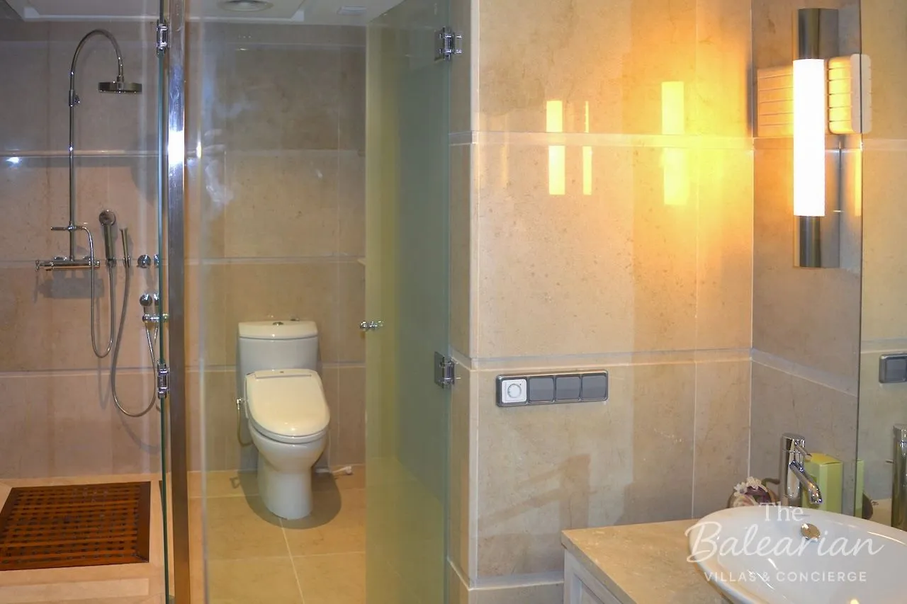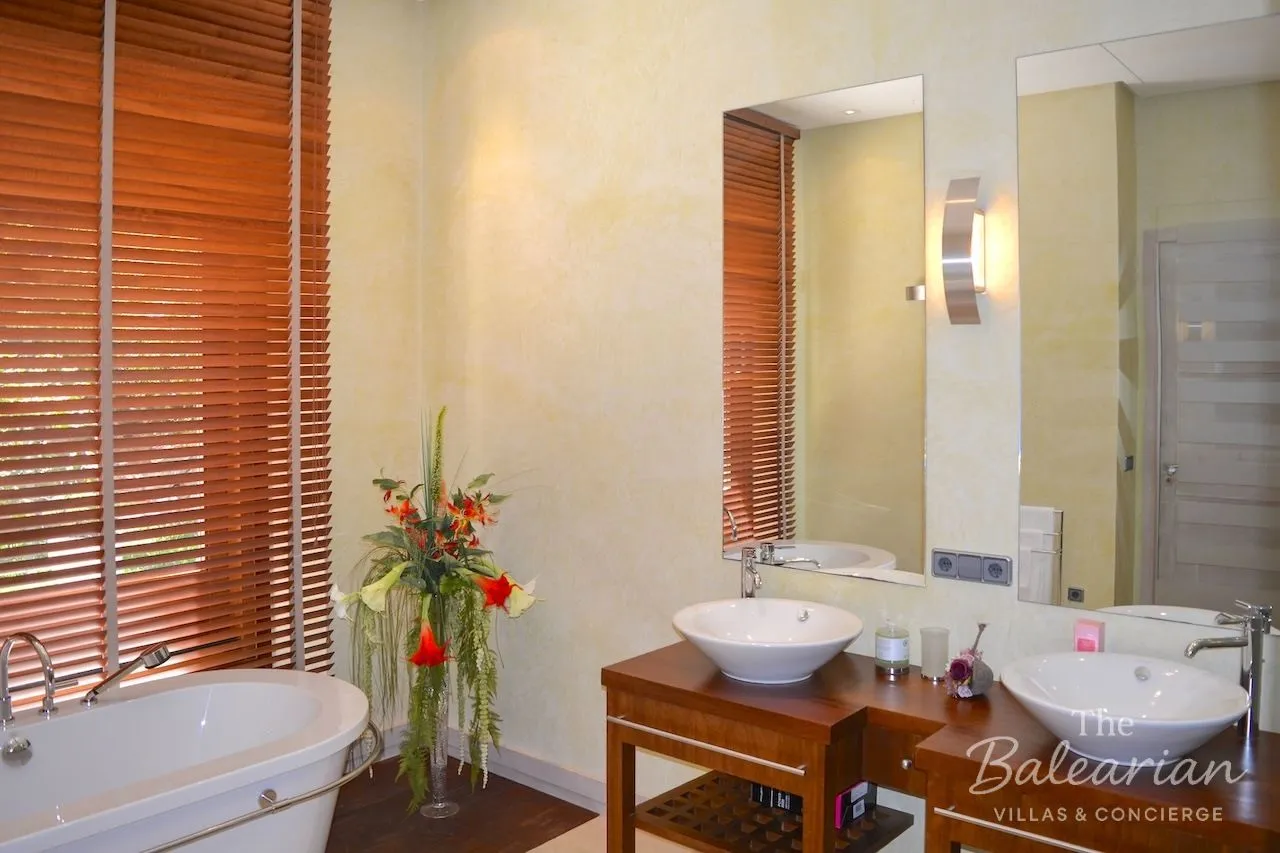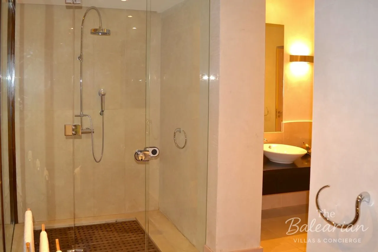 The lower living level is dedicated to private accommodation. Here you will find three spacious bedrooms, each with a king‑size bed, air conditioning, and a luxurious en‑suite bathroom with shower and bathtub. The master suite also features a dressing area and direct access to the garden and pool area. The two additional bedrooms likewise open directly onto the pool terrace. A separate TV room and a utility room provide additional comfort.