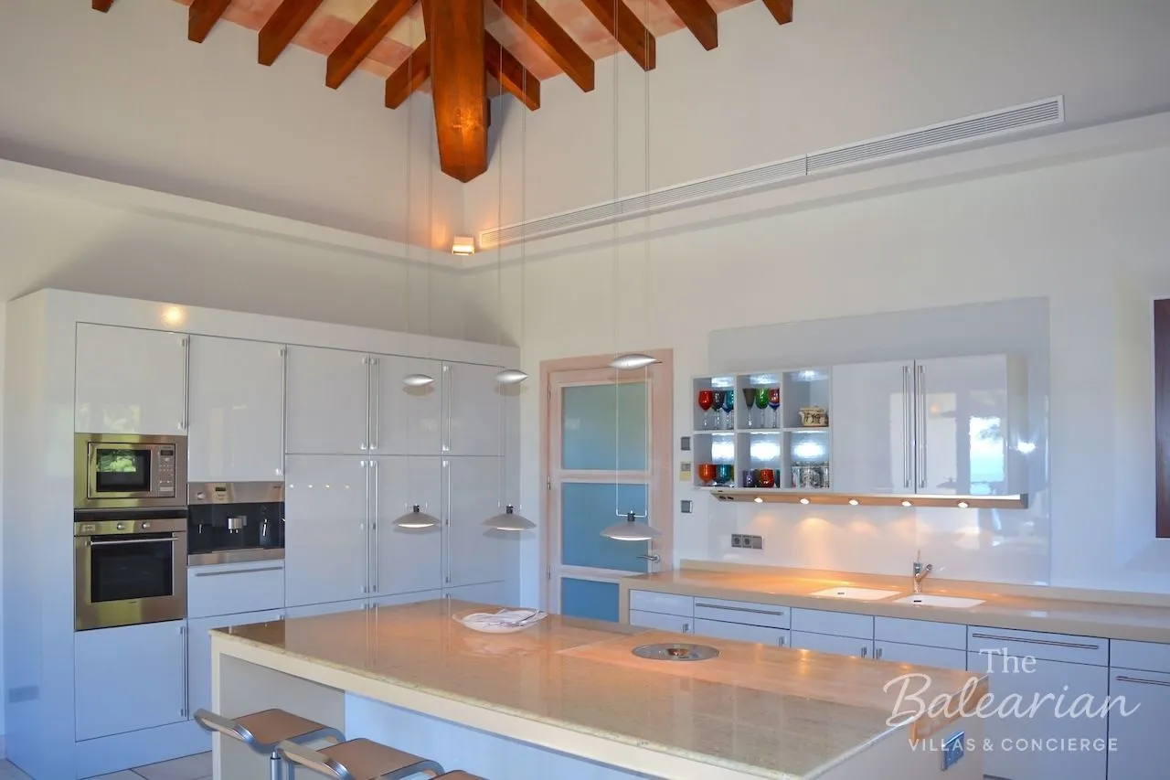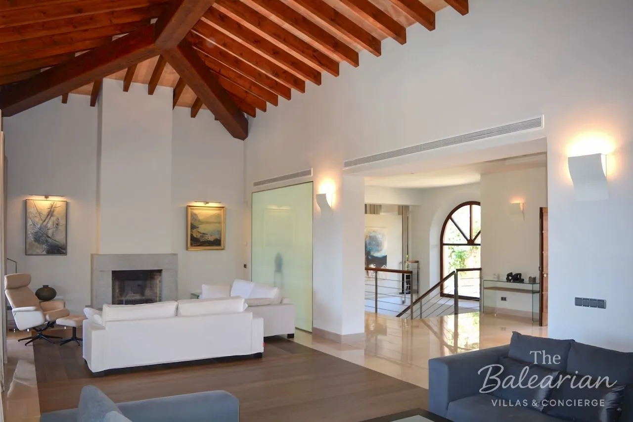 The architecture and construction quality of Villa Coral Mallorca meet the highest standards. The open‑plan living and dining area, with ceilings up to six meters high and exposed wooden beams, creates a spacious, light‑filled atmosphere. The upper living level features a representative entrance area, two elegant living rooms with fireplaces, a generous dining area with fireplace, and a modern branded kitchen with high‑quality fittings. A separate pantry with wine fridge and a guest WC complete this level. On the sea‑facing side, a covered terrace wraps around the house, offering several seating areas and a large dining table with stunning sea views.